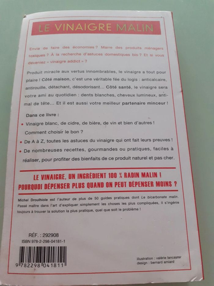 Livre : Le vinaigre malin De Michel Droulhiole Tous les bienfaits pour la santé et la maison d un ingrédient 100% naturel. Quelques pages un peu pliées (voir photos 6 7 et 8) Envoi uniquement via Mondial Relay