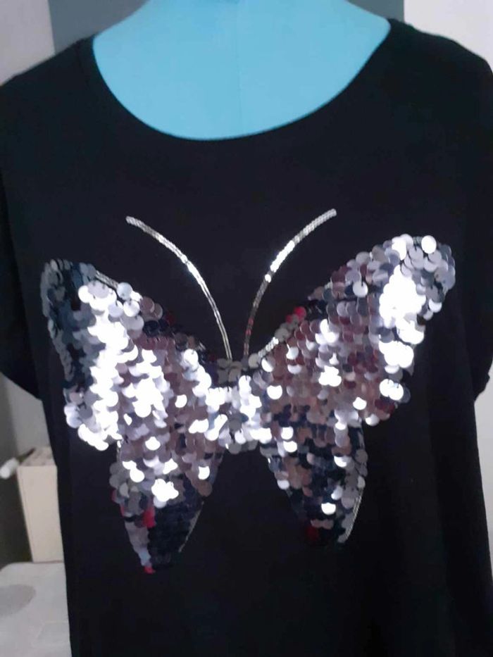 T-shirt noir avec papillon en strass Taille 44/46 Marque Rainbow 50%coton 50%viscose Très bon état porté 1x Envoi uniquement via Mondial Relay