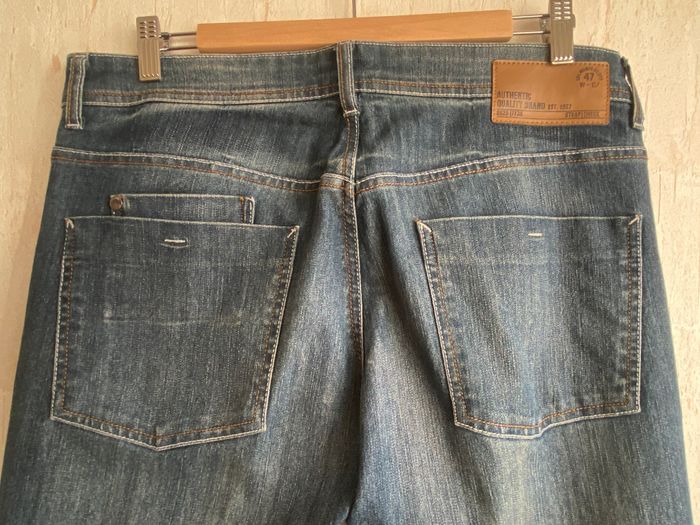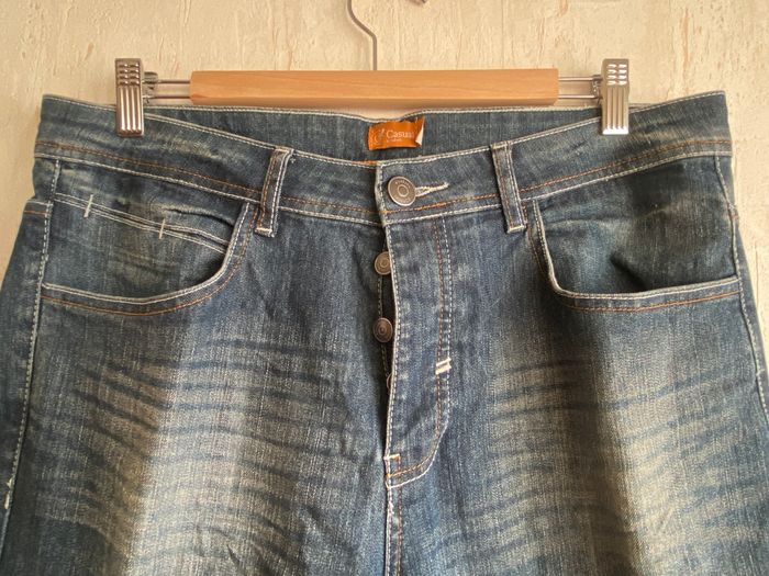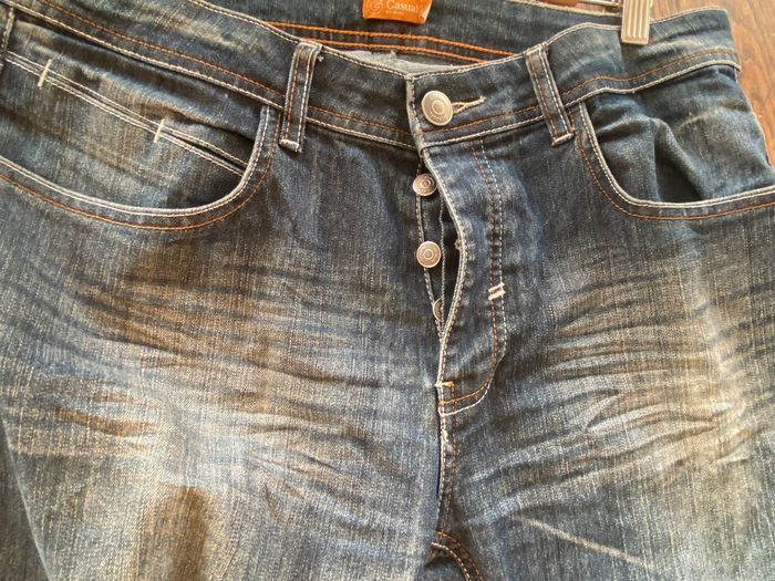 Jean homme taille 42. Tissu aspect froissé haut devant et derrière niveau genoux. 3 poches avant et 2 au dos. Fermeture par boutonnage. Matière 69% coton, 30% polyester et 1% élasthanne. Hauteur totale 106 cm, entrejambes 79 cm, tour de ceinture 94 cm.