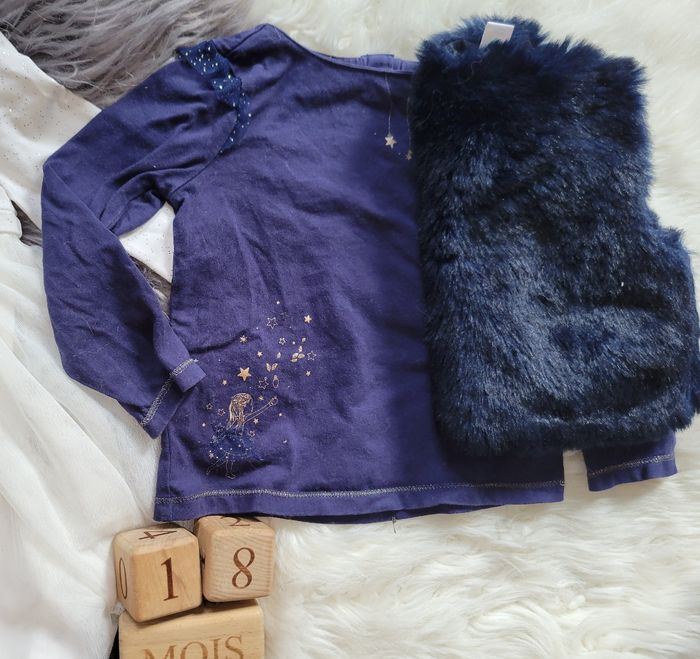 Magnifique robe pailleté jusque dans le tulle. Okaidi 18m. Gilet sans manches tex 18m. Tee-shirt de fête sergent major petit 2ans