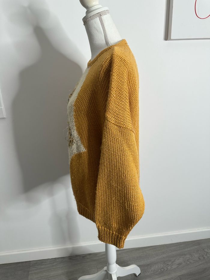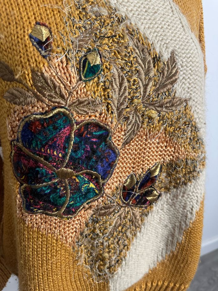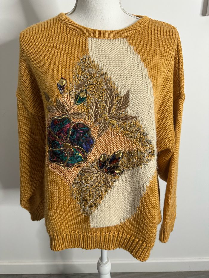 Pull en maille moutarde et broderies velours fleurs Vintage T42 XL