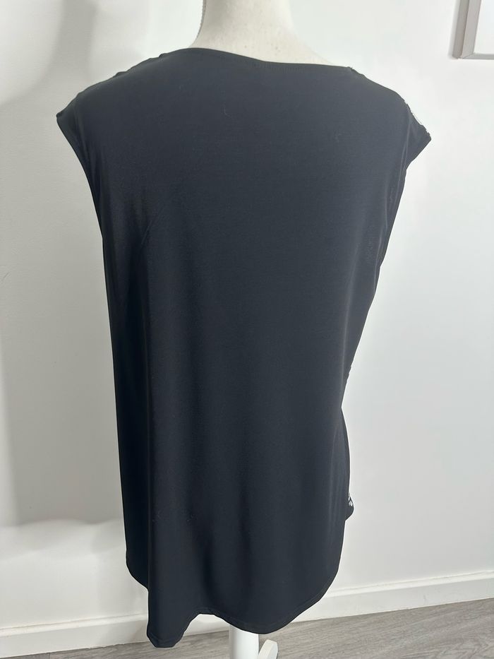 Blouse - Excellent état - Taille 3 équivalent 40 L - Noire blanche et rouge - Imprimés géométriques - Sans manches - Coupe asymétrique - Polyester et élastane Dimensions: - 50 à 60cm niveau aisselles - 53cm de long à l’avant au plus court - 74cm de long à l’arrière