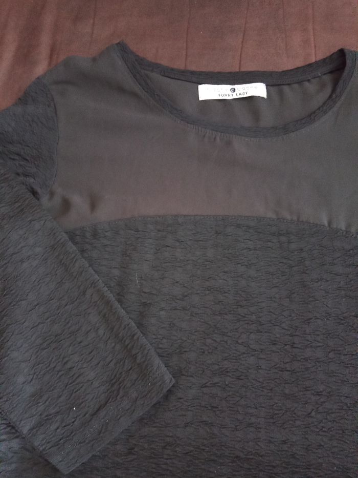 Joli Haut Fantaisie Taille 38/40 "Cache Cache" Couleur: Noir uni Manches 3/4 Côté Fantaisie avec sa Transparence (comme du voile) dans le haut Dimensions: Longueur 58cm - aisselles à aisselles 41,5cm - épaule à épaule 40cm Haut en très bon état, peu porté (vendu comme sur les photos)