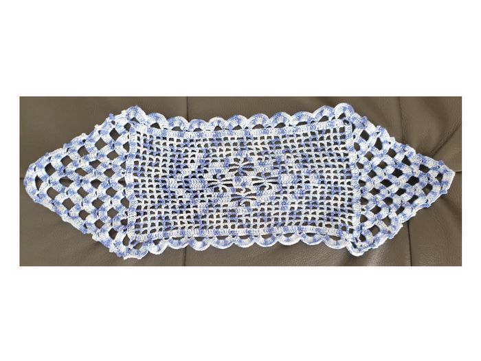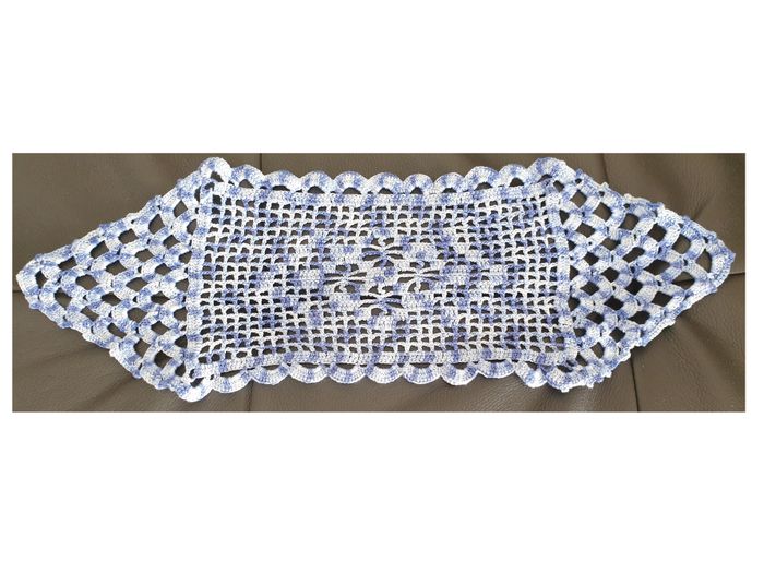 Napperon 28. Napperon différents tons de bleus fait main. Longueur: 42 cm. Largeur: 15 cm. En très bon état. Sans marque. 2€. #vero38110decorations
