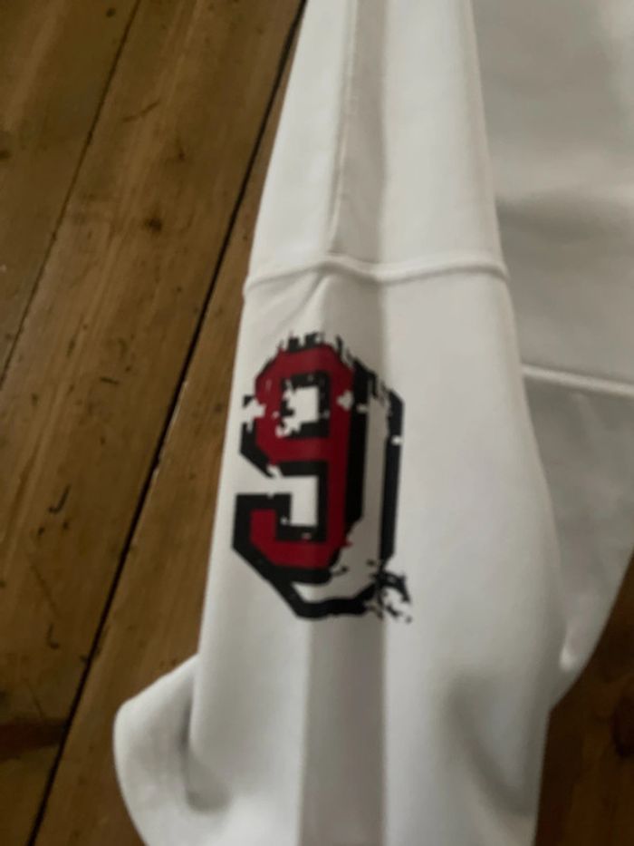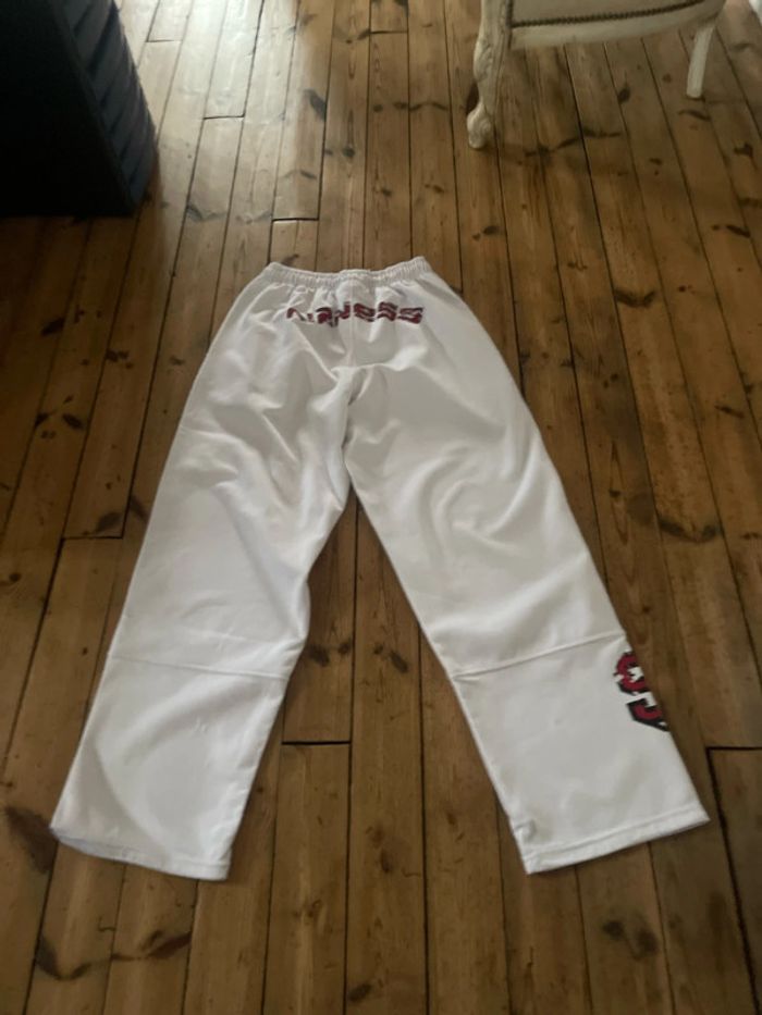 Jogging blanc, en très bon état. Taille L mis une ou deux fois avec deux poches qui se ferment avec des fermetures.