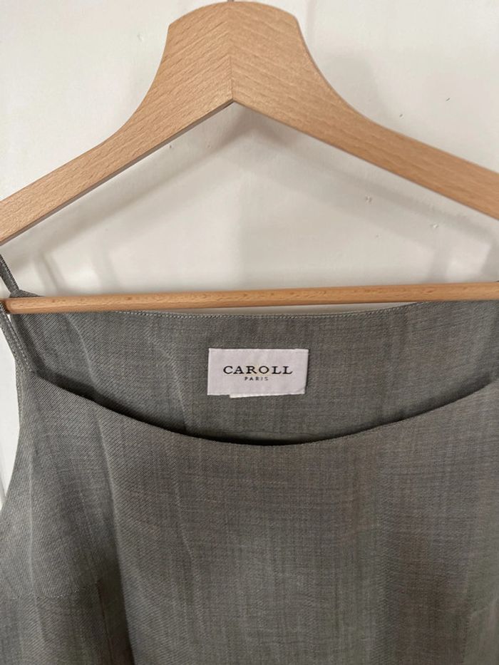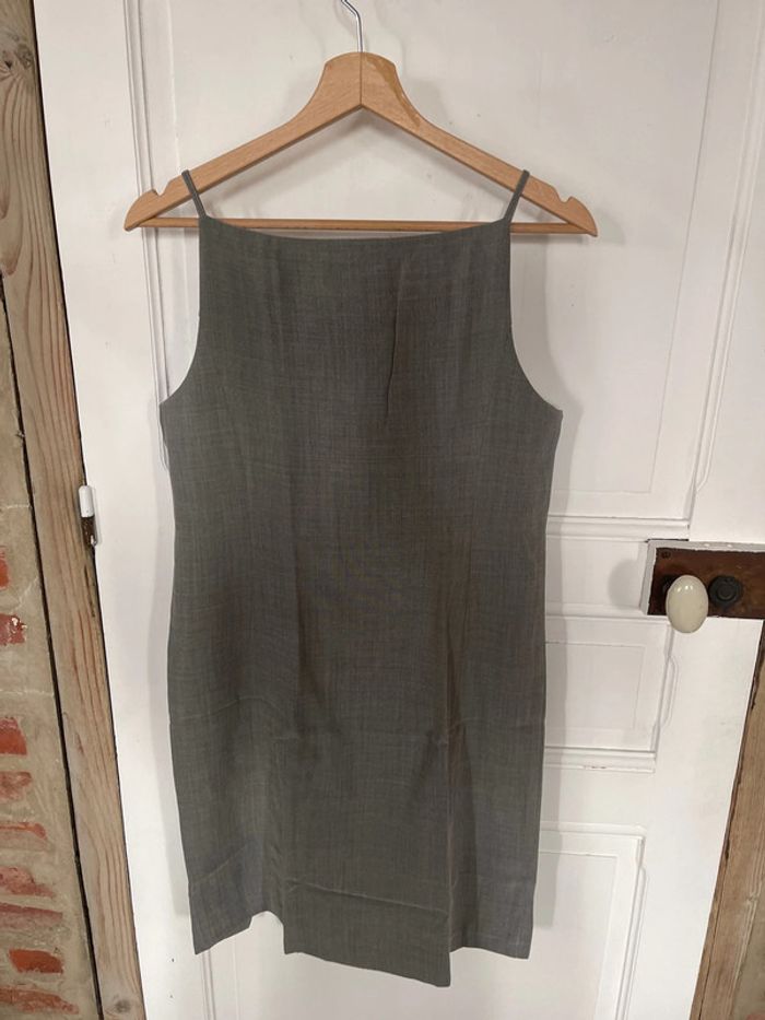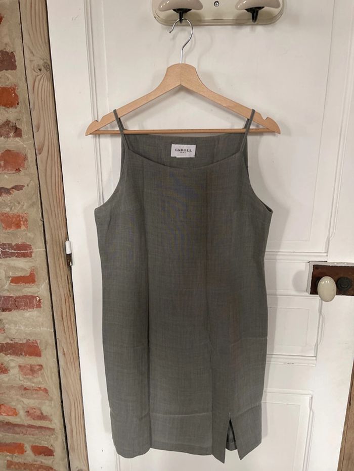 Robe à bretelles, Carole grise en très bon état avec une fente Pour la fente elle est un peu plus ouverte et un peu décousue voir dernière photo pour la taille, je pense que c’est une taille xs 44 cm sous aisselle d’un côté à l’autre, 42 cm de taille pour plus d’informations, me demander des mesures