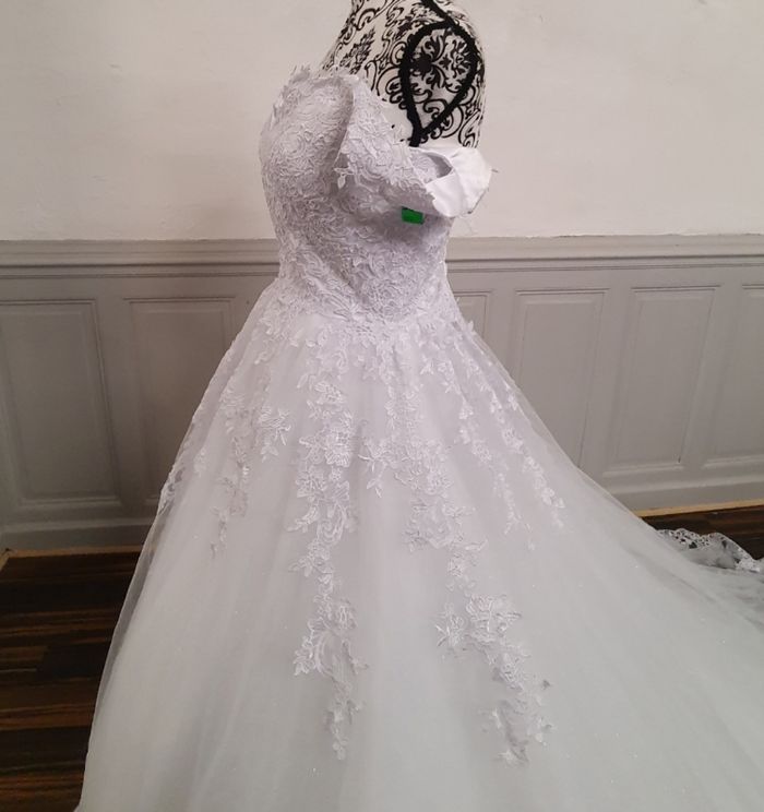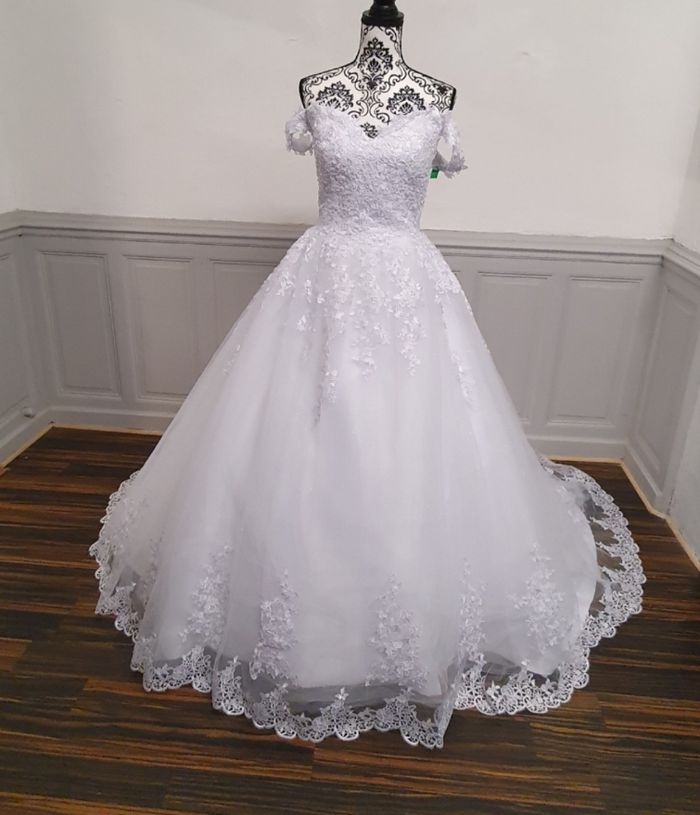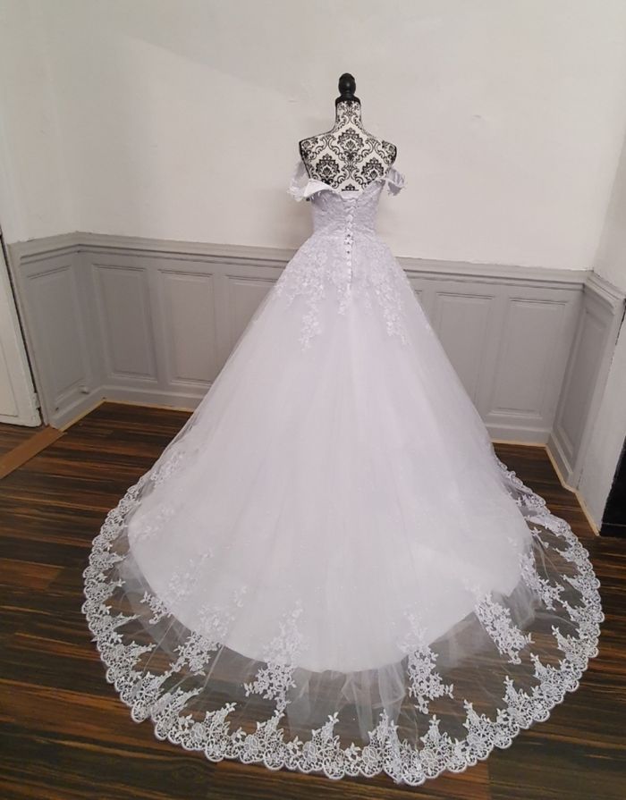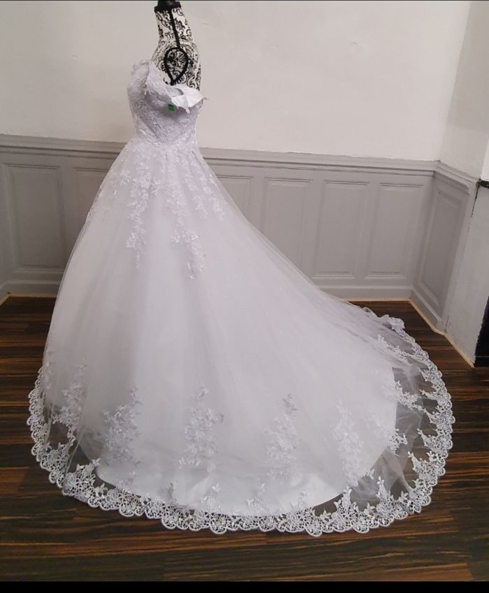 Plongez dans un univers féérique avec cette somptueuse robe de mariée, idéale pour une cérémonie grandiose et inoubliable. Silhouette et coupe : Cette robe de mariée adopte une coupe princesse qui sublime la taille et offre une allure majestueuse. Le jupon volumineux en tulle crée un effet aérien, parfait pour une mariée qui rêve d'élégance et de romantisme. Bustier raffiné : Le haut est orné d'une dentelle florale délicate, couvrant entièrement le bustier. Le décolleté en cœur met en valeur la silhouette, tandis que les manches tombantes dévoilent les épaules avec grâce et romantisme. Jupe et traîne : La jupe en tulle est sublimée par des appliqués de dentelle en relief, qui descendent doucement jusqu'à l'ourlet. Une bordure de dentelle raffinée encadre le bas de la robe, ajoutant une touche de sophistication. La robe est également dotée d'une légère traîne, pour un effet royal inoubliable. Détails et confort : Légère et bien ajustée, cette robe garantit confort et élégance tout au long de votre journée spéciale. La fermeture par laçage au dos assure un maintien parfait pour la taille 38 et 40
