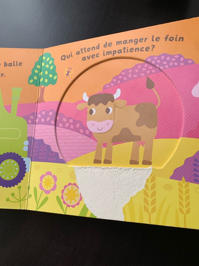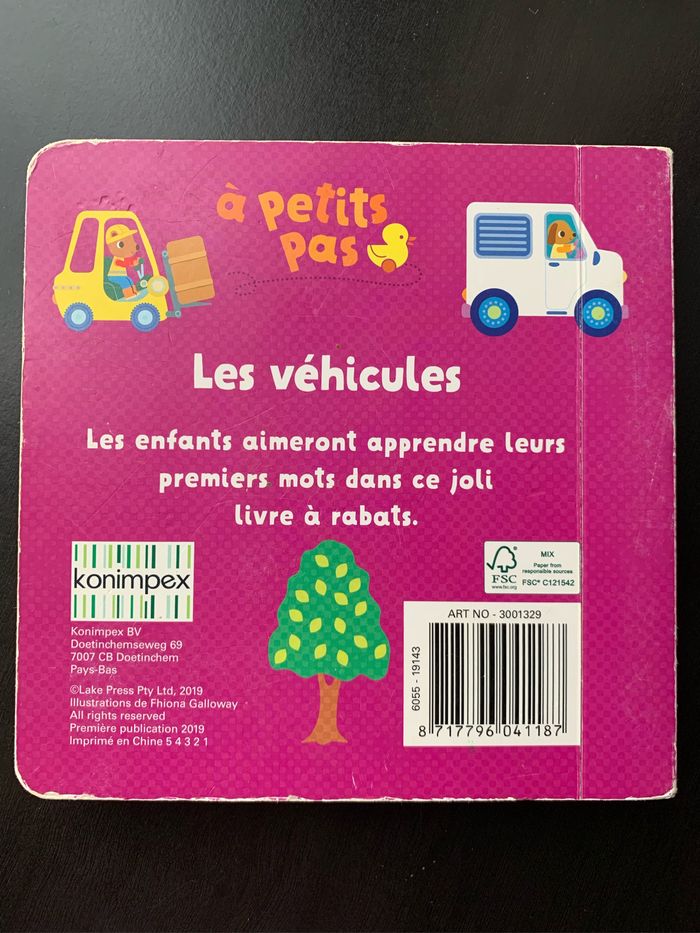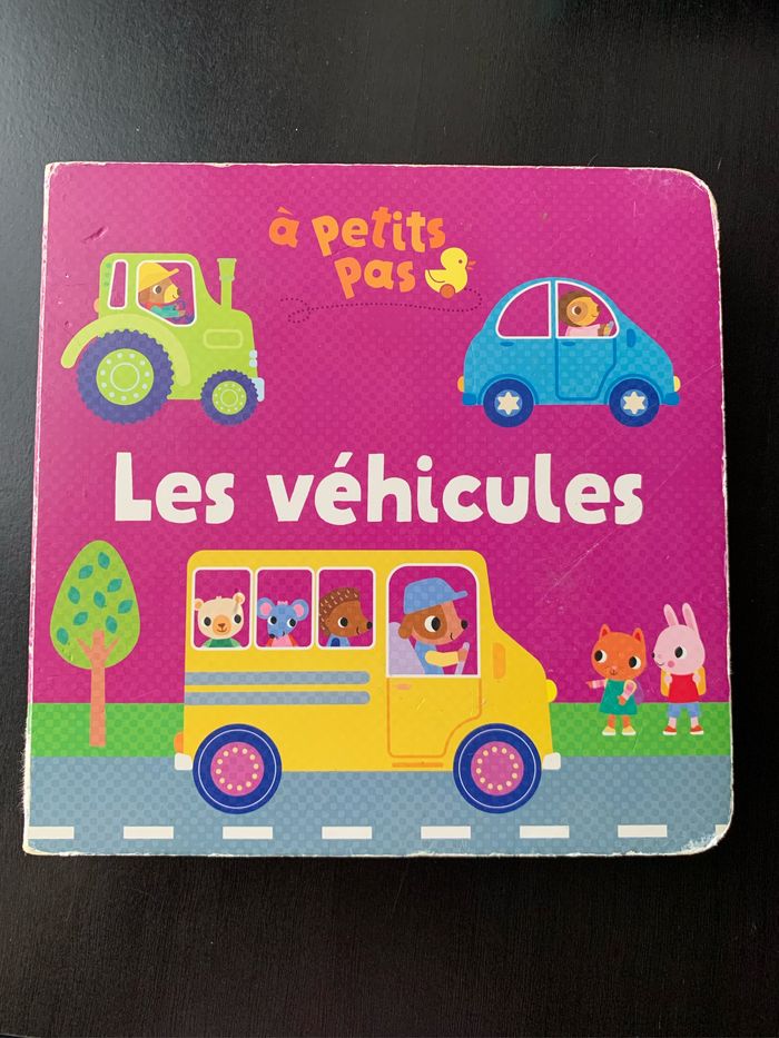 Les véhicules. Livre à pages très épaisses avec 5 rabats. Il en manque un ( voir photo) mais reste intéressant à regarder pour apprendre ses premiers mots