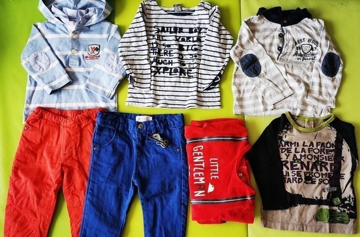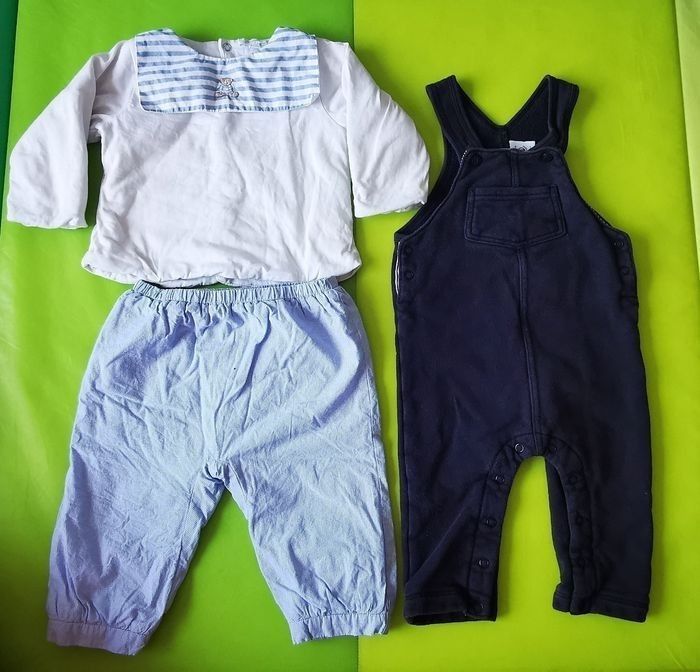 Lot 12 mois hiver 19 pièces 2 bodies 1 pyjama 3 vestes 1 pull ensemble 2 pièces pull et pantalon 2 combinaisons/salopette 1 ensemble Jacadi blanc et bleu Vichy 4 t-shirt/polo manches longues 2 pantalons