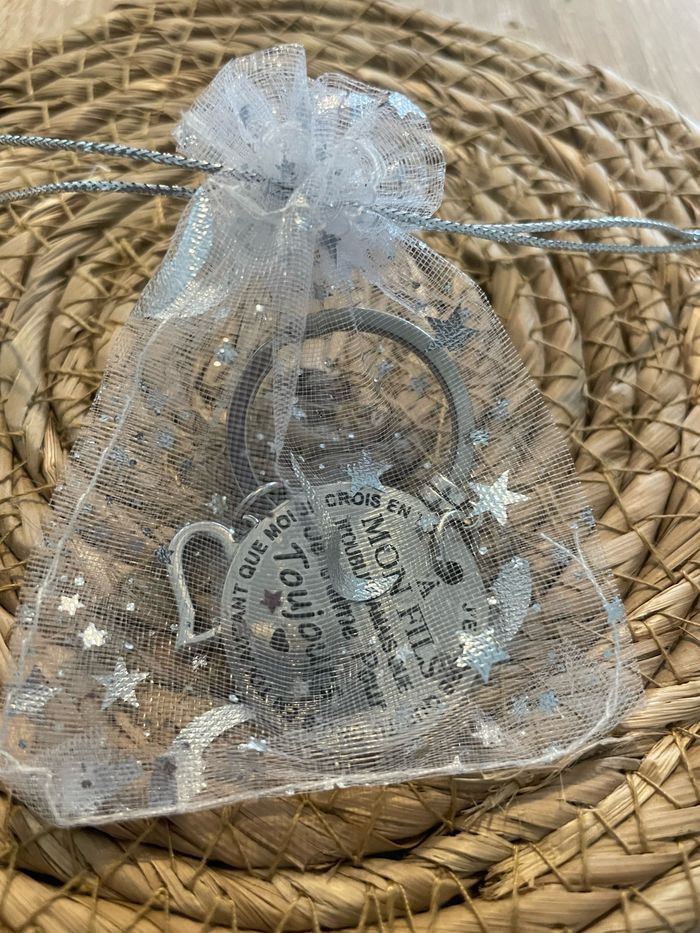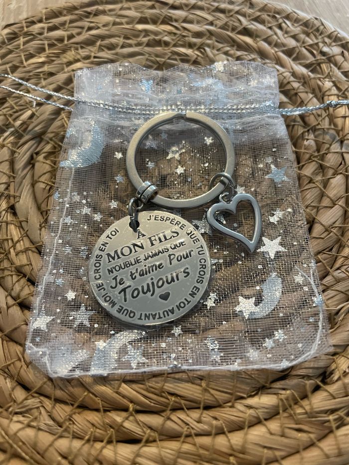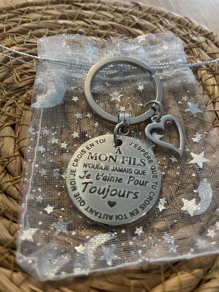 Porte clé acier inoxydable avec message pour son fils neuf dans un petit pochon cadeau. Possibilité de graver l’arrière #sandra13190chapeau_accessoire_bijoux_sac