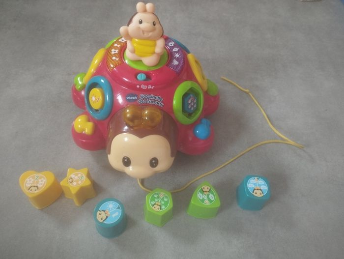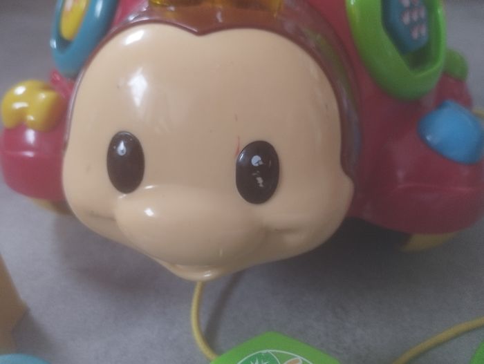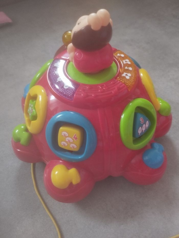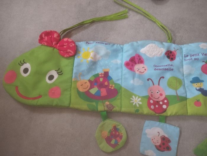 Très bon état . Coccinelle a tirer. quelques traces mais rien de méchant ( voir photos ) 2 modes de jeux. Chansons , apprendre les chiffres et les formes , 6 formes détachables. Chenille a accroché. 2 modes : jour et nuit. Plusieurs comptines / berceuse. Très pratique Il y a des attaches pour l' accrocher au lit . Ça s'arrête après quelques minutes. D'autres jouets pour bébé dans mon dressing.