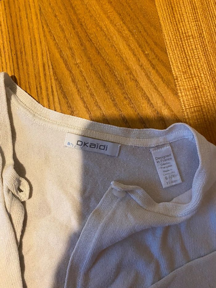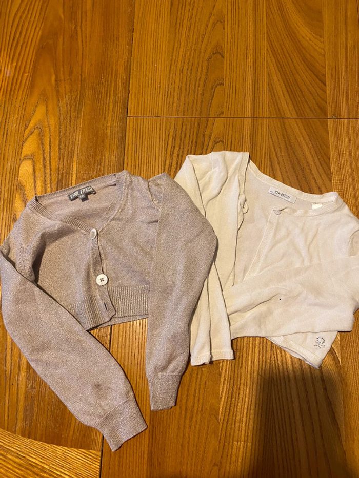 Vend lot de 2 petits gilets Le gris à paillettes de vynil fraise Le blanc de okaidi Taille 6 ans Très bon etat