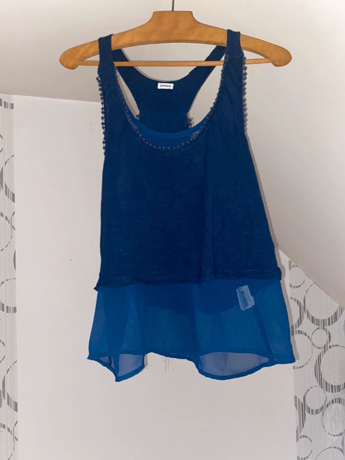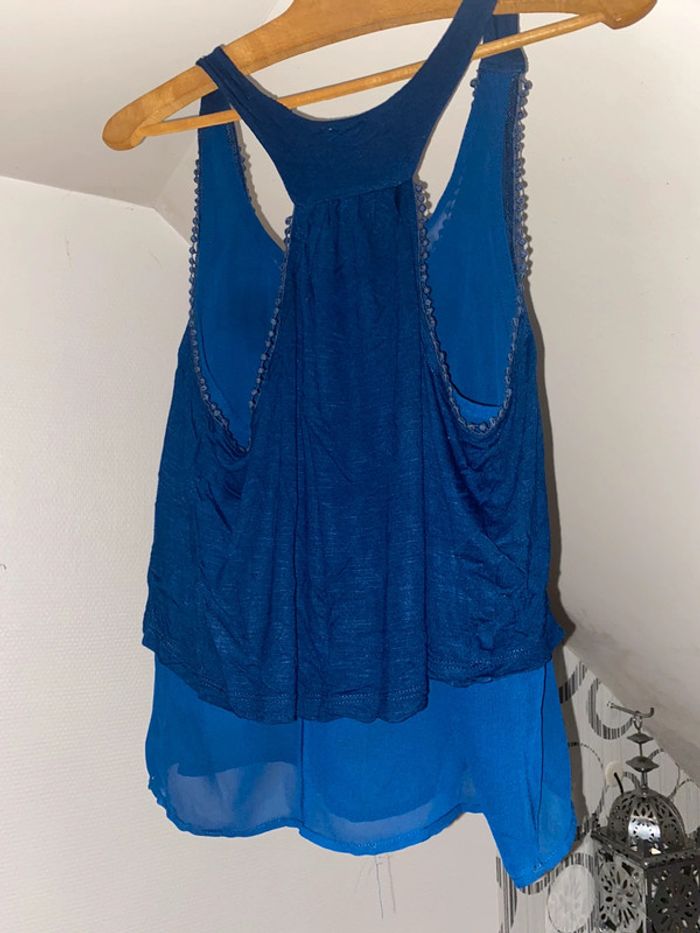 Vend debardeur bleu marine pimkie Il est en deux épaisseur, une style voilage ( transparente) et une en coton Très bon etat S