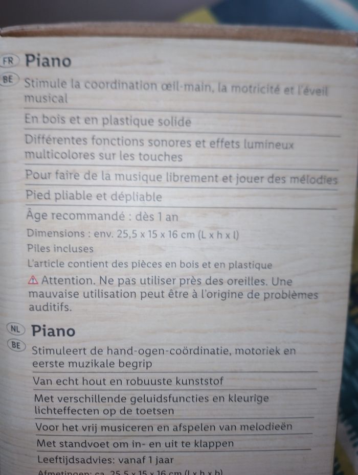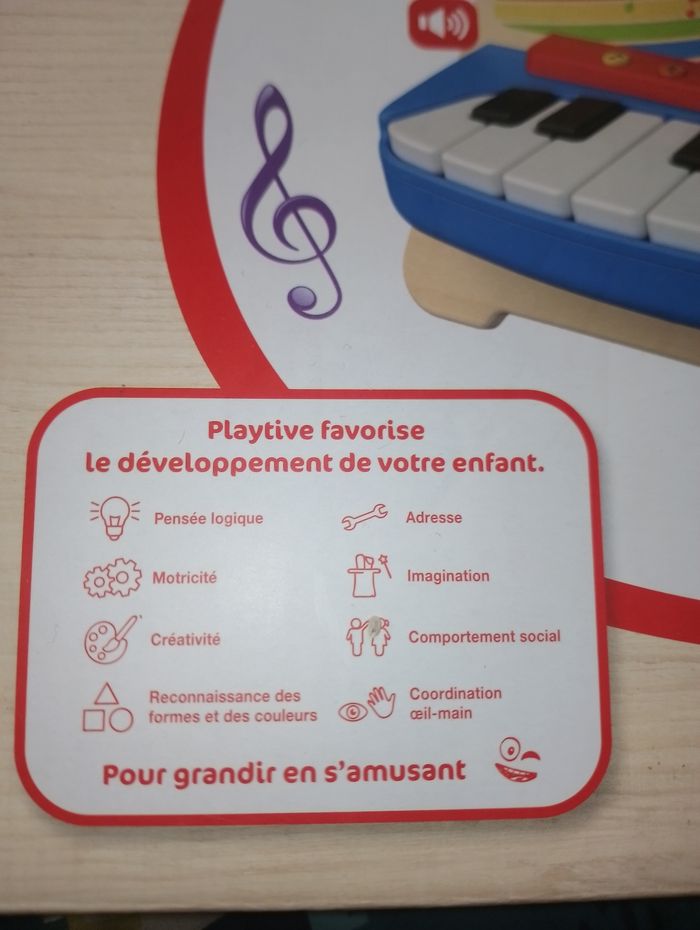 Piano en bois et plastique solide Playtive 1an et + * Différentes fonctions sonores et effets lumineux multicolores sur les touches * Pied pliable et dépliable * Touches de fonction : mode musique, crazy sound, mélodie, xylophone et piano * Commande marche/arrêt dessous avec réglage du volume à 2 niveaux