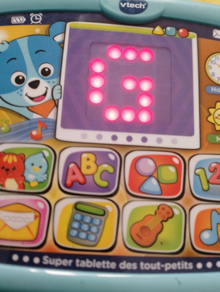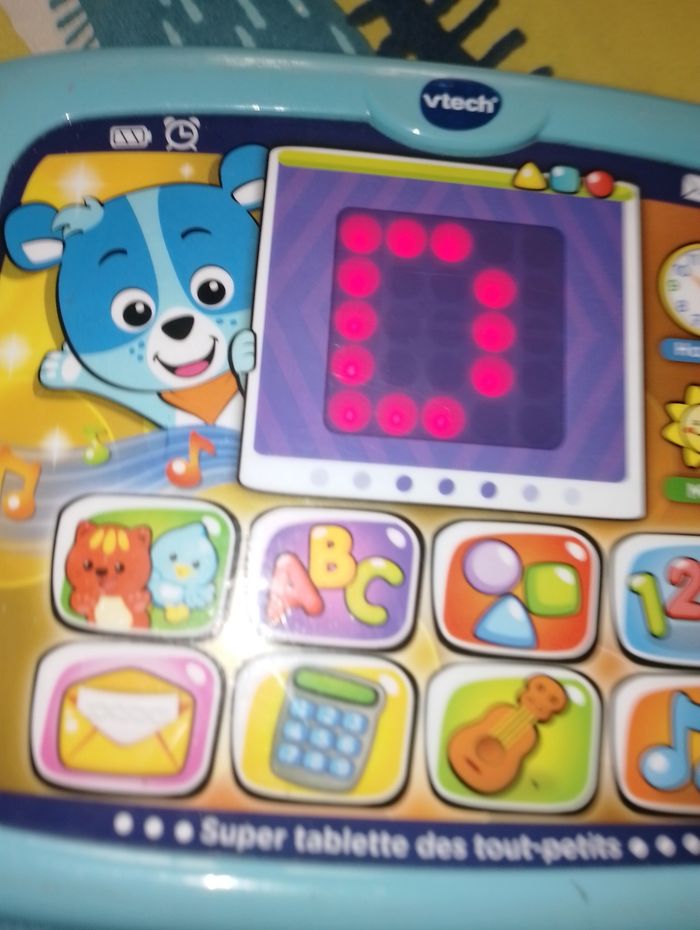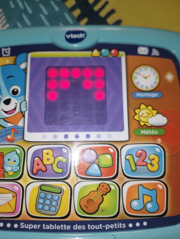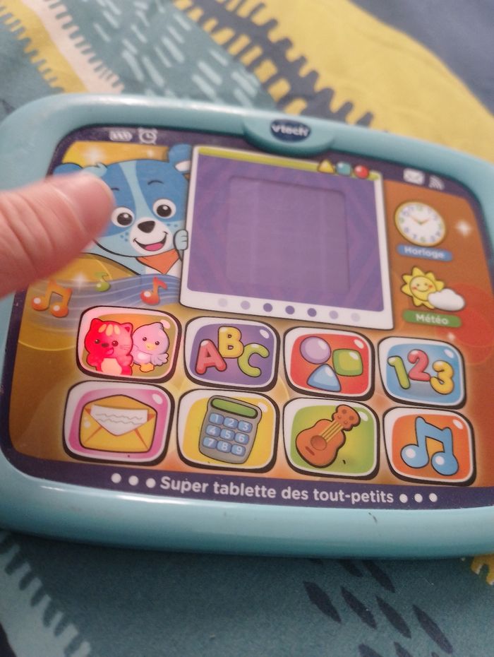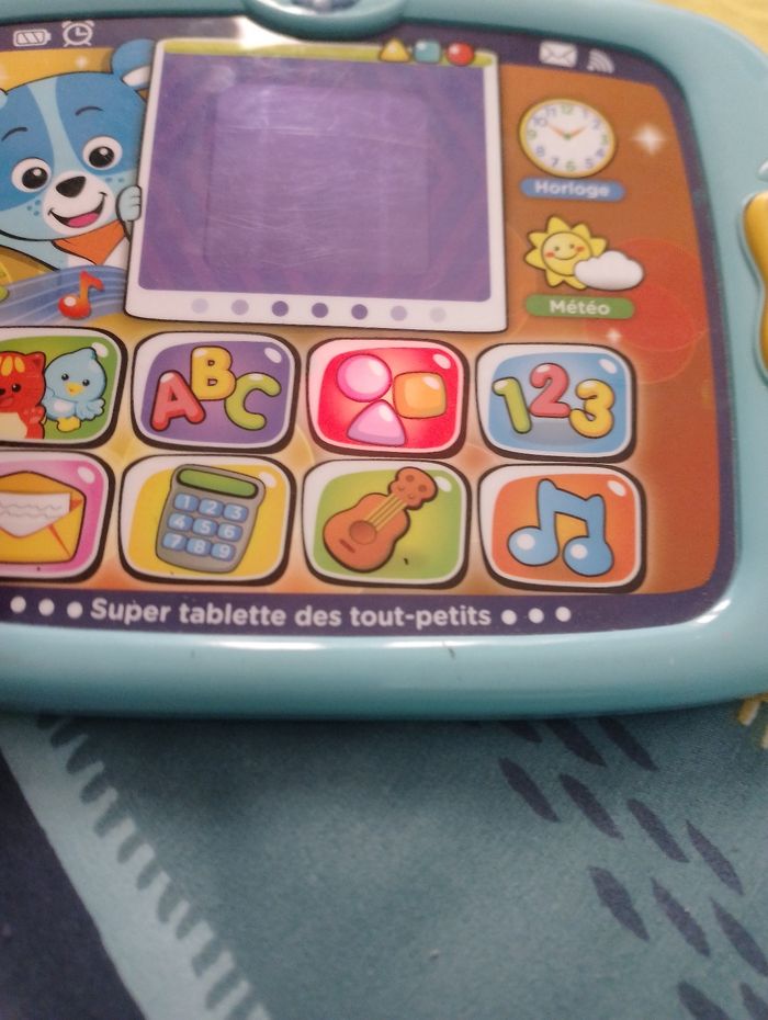 Super tablette des tout-petits Nino Vtech 12 - 36 mois La première tablette des tout-petits pour découvrir en compagnie de Nino le petit ourson ! 100% tactile et lumineuse. Génial, comme sur une vraie tablette, on peut toucher l'écran de la tablette et faire glisser son doigt pour déclencher des animations, des sons rigolos et passer à l'animation suivante. Activités pour découvrir les lettres, les chiffres, les formes, les instruments de musique, déclencher des cris d'animaux, lire des messages envoyés par ses amis, apprendre à compter. 2 chansons sous forme de karaoké incluses pour découvrir l'alphabet et les chiffres en musique. 1 touche tactile météo pour connaître le temps qu'il fait et 1 touche tactile horloge pour voir des animations amusantes sur les différents moments de la journée. 1 bouton appareil photo permettant de jouer à zoomer et à dézoomer. 20 mélodies et 5 chansons. Réglage du volume sonore.