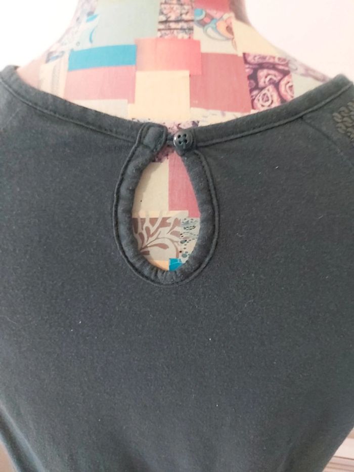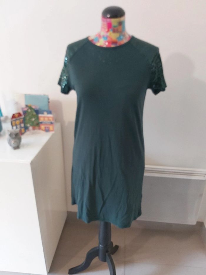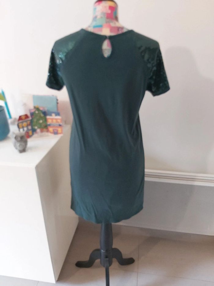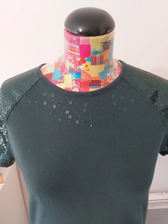 Robe, vert foncé, avec sequins sur l'encolure, et empiècements à sequins sur les épaules. Agréable à porter. 50% coton 50% modal. #clairou44_quatorzeans #clairou44_quinzeans