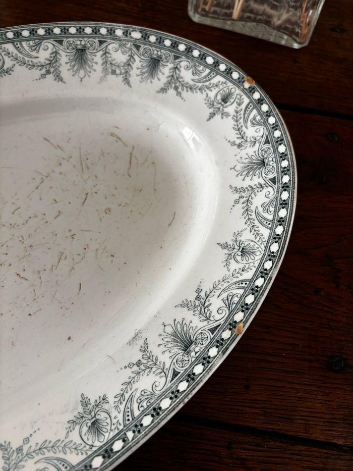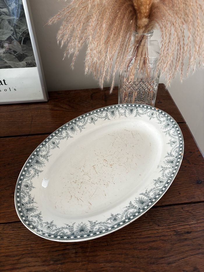 Plat ancien en terre de fer de chez Moulin des Loups & Hamage Modèle Wilbur Joli décor vert ATTENTION état moyen comme le prouvent les photos : le fond du plat présente des rayures, deux petits manques sur le bord du plat 35,3 cm x 24 cm