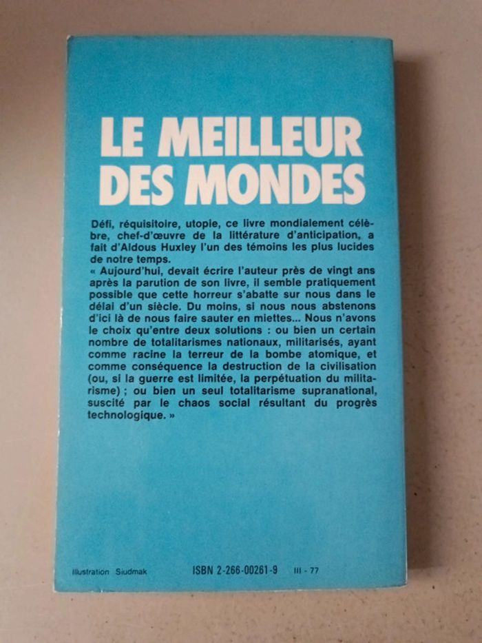 Édition rare et collector Aldous Huxley le meilleur des mondes. Édition 1977 Voici le lien pour voir tous mes livres : #romain75015_Livres. Envoi rapide et soigné bien protégé pour le transport. N'hésitez pas à faire un lot pour avoir des réductions et mutualiser les frais de port.