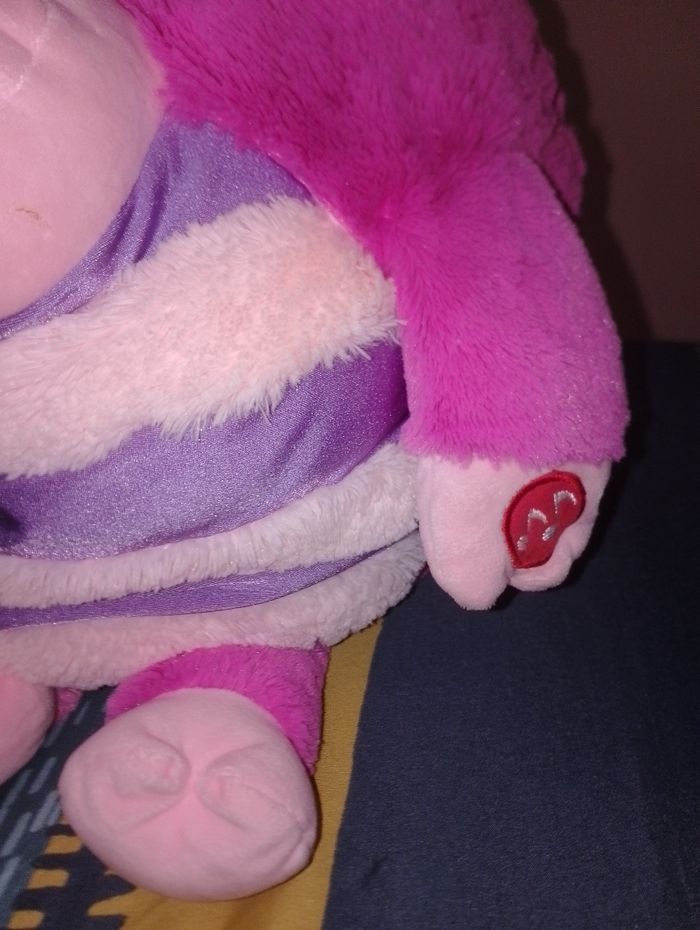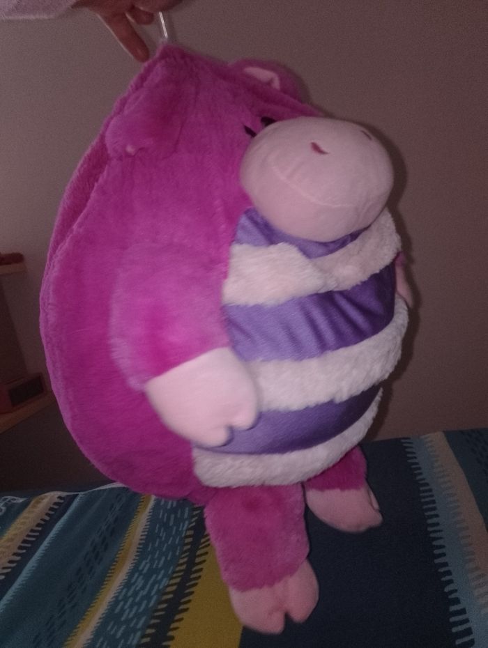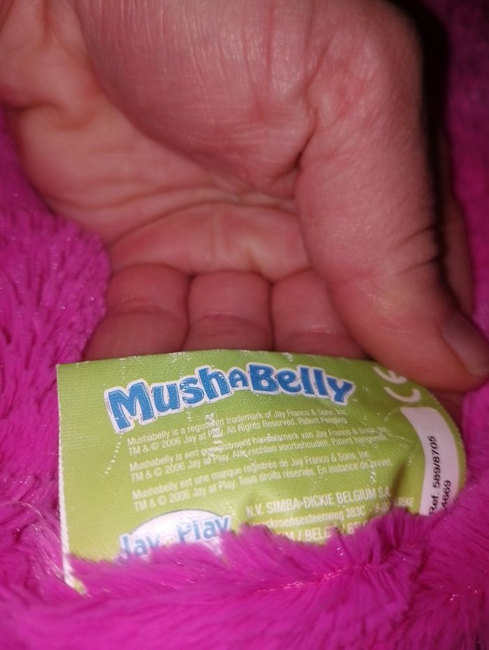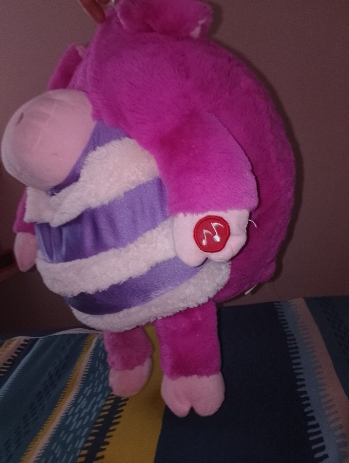 Cochon qui fait le bruit du cochon BUDIBUZZ MUSHaBELLY jay AT play de belgique diametre environ 30 cm (assis) Il suffit d'appuyer dessus et il fait le bruit du cochon! sur le bouton a sa main, il faisait du bruit également et plus de pile (a découdre pour voir si pile changeable où non) Avec un petit crochet qui peut etre enlever pour les enfant où pour l'accrocher sur une barre où autres! Très rigolo pour faire un cadeau à un adulte où alors un enfant!