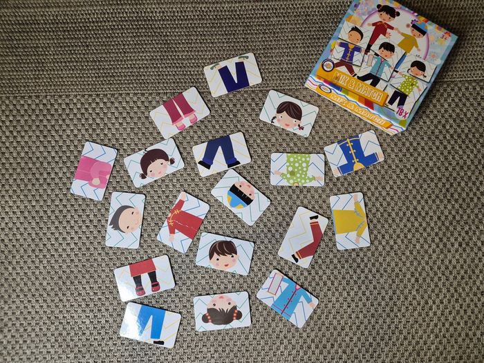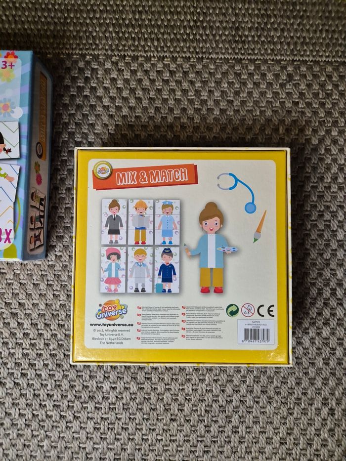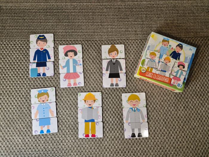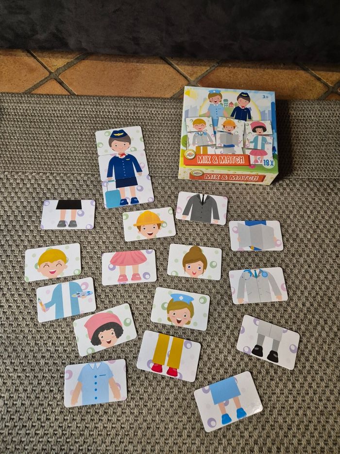 Lot de 2 jeux de puzzles mix. Jeux complets. L'enfant a plusieurs possibilité pour associer la tête avec le bustes et les jambes. Quelques cartes sont abîmées (voir les photos) mais ne gêne en rien pour jouer. Dans l'ensemble les cartes et boîte sont en très bon état.
