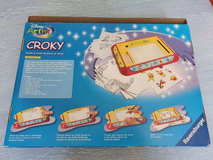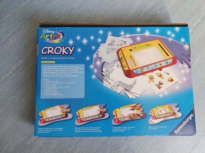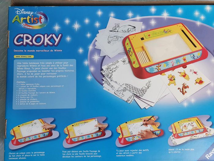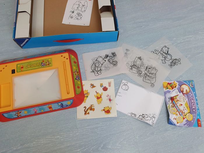 1 module table lumineuse Croky, 1 carnet de 14 feuilles calques avec personnages et accessoires à reproduire, 10 feuilles blanches, 10 feuilles pré imprimées avec des paysages de l'univers de Winnie 6 crayons de couleurs, 1 feutre noir fin, 1 notice de 8 pages en couleur A l'aide d'une table de projection simple votre enfant réalisera de magnifiques dessins de l'univers de Winnie. Croky assure un résultat qualitatif et permet de développer la créativité et l'imagination de vos charmantes petites têtes blondes. Servi 2 fois ,2 feuilles de calque ou il y a du stylo dessus, sinon en très bon état ! N'hésitez pas à aller voir mes autres ventes classées par #eloio 😉 #eloiojeuxjouets #eloiowinnie #eloiodisney #eloioeducatif