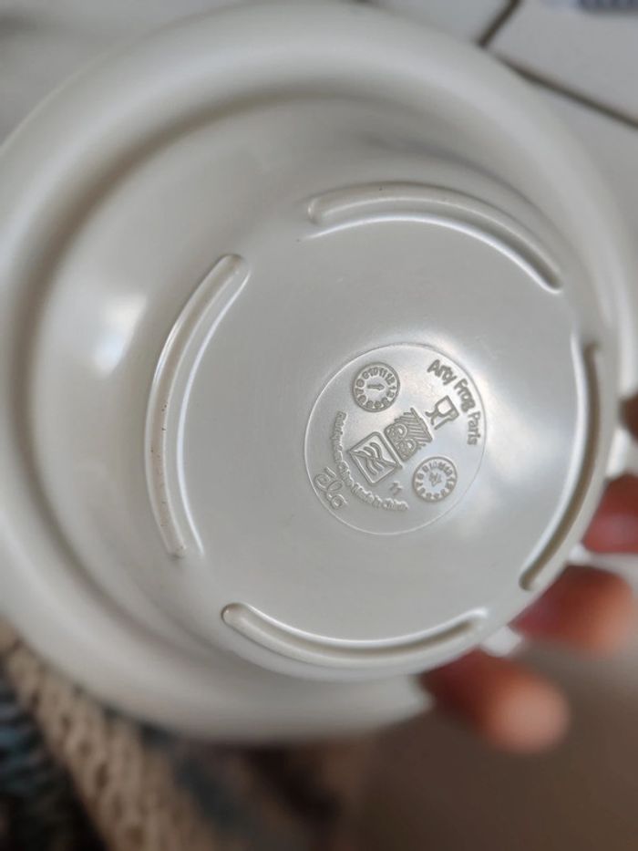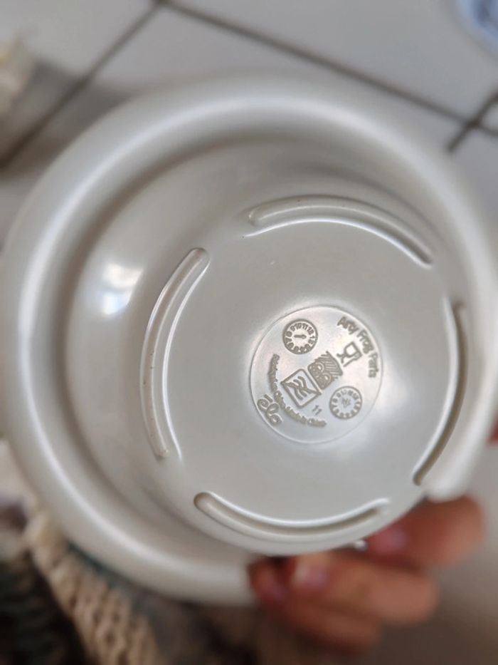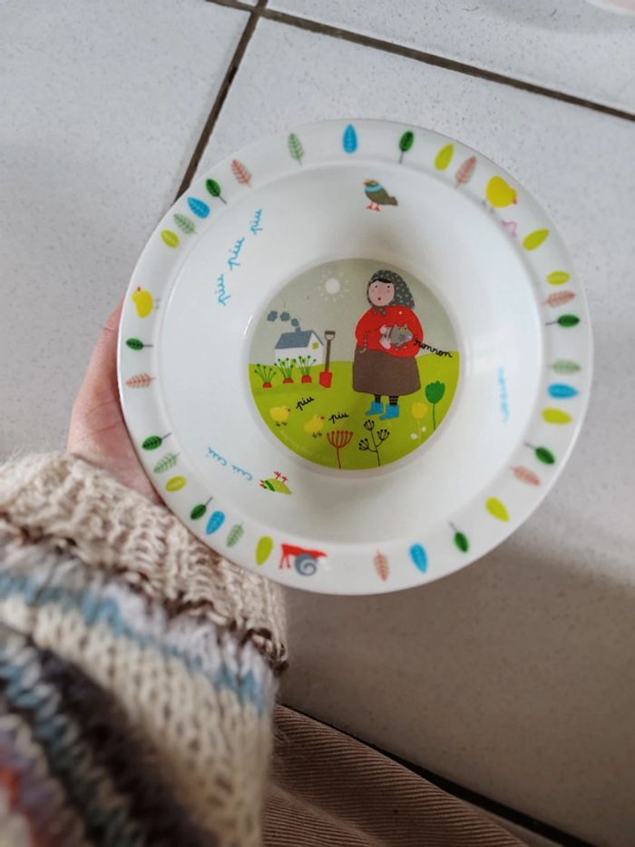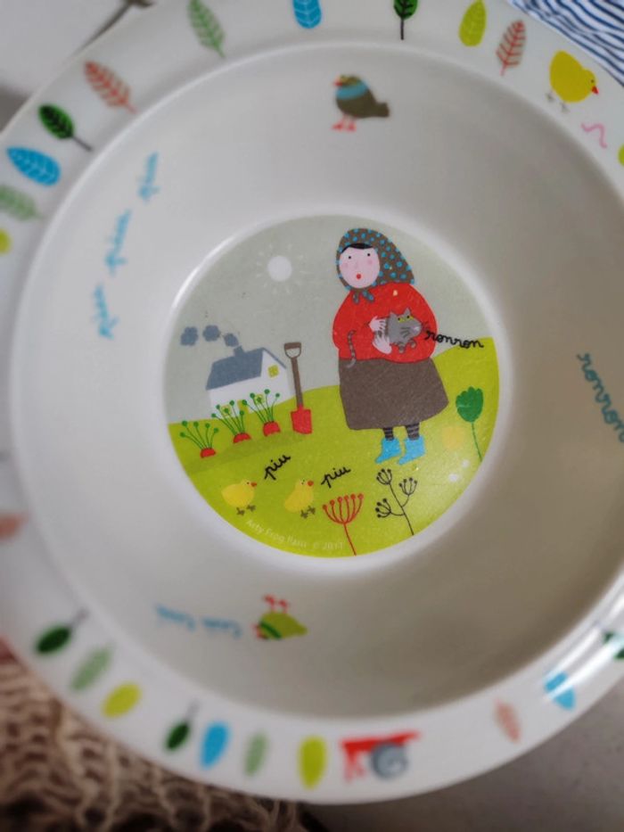 Assiette creuse pour enfant En mélamine Blanche et multicolore Une fermière avec son chat qui ronronne ("ronron") et des poussins ("pui pui") Très bon état général ➡️ #ursullabuffayvaisselle #ursullabuffaybébé
