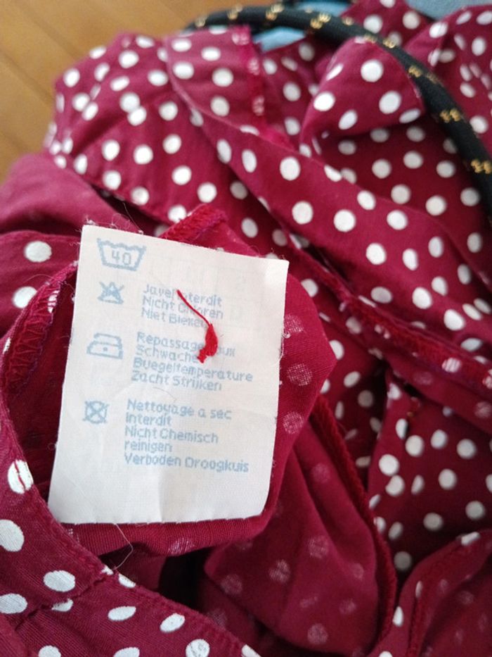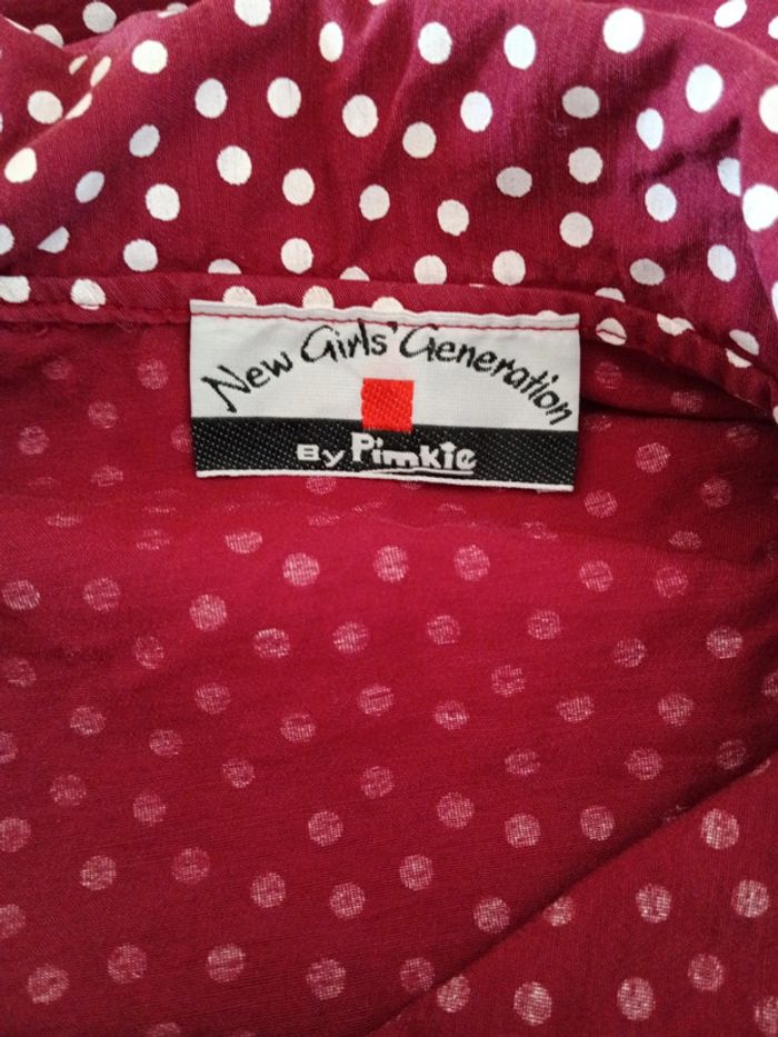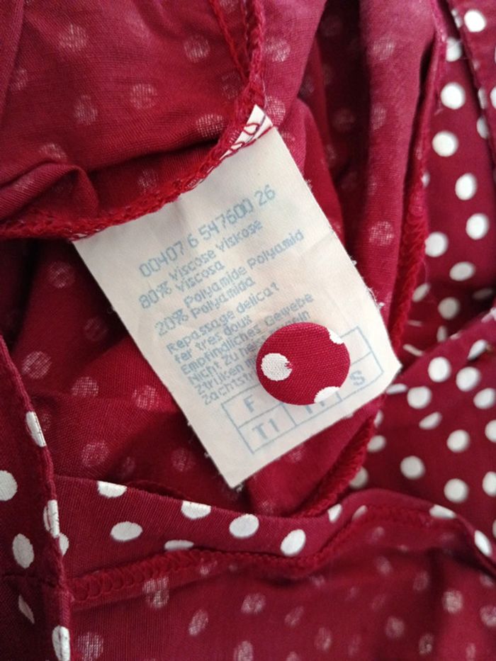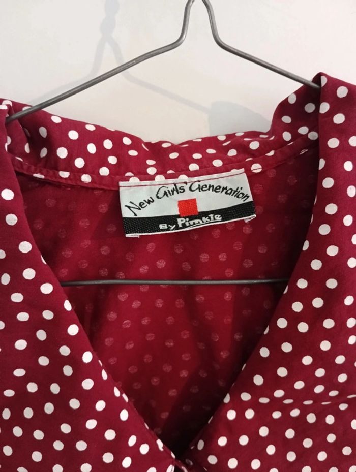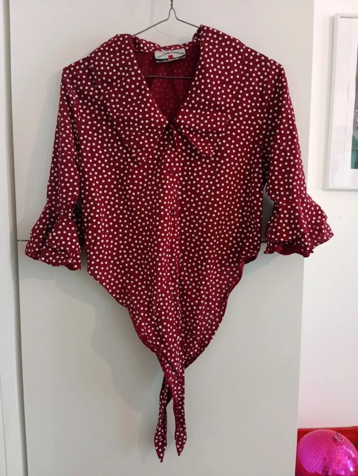 Chemise crop vintage à pois à nouer manches 3/4 volantées Grand col. Pimkie vintage. Taille 1 /S estimée doit convenir à 38/40 Mesures Epaules 37cm Aisselles 46cm Longueur 45cm