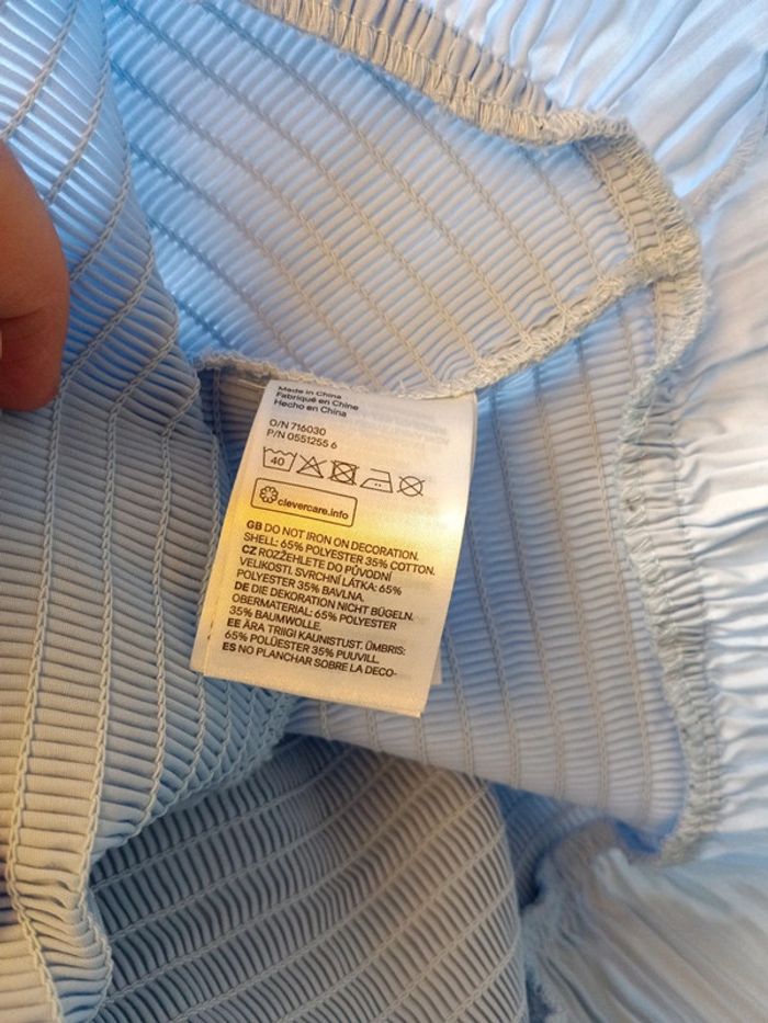 Chemisier bleu ciel H&M taille 40 Taille et bout des manches smockés. Bas et bout des manches plissé. 2 Boutons de rechange. Coton & polyester