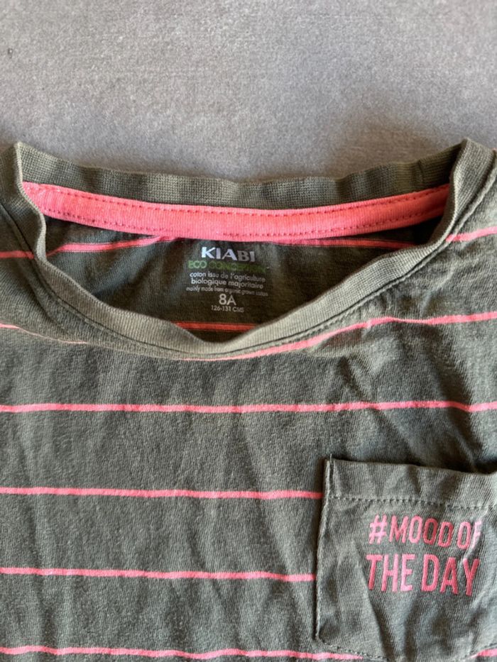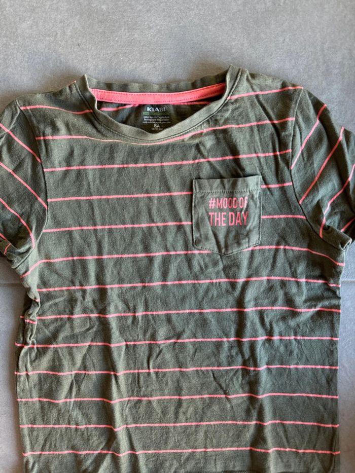 Tee shirt manches courtes en coton neuf Couleur kaki avec rayures corail Taille 8 ans Marque Kiabi