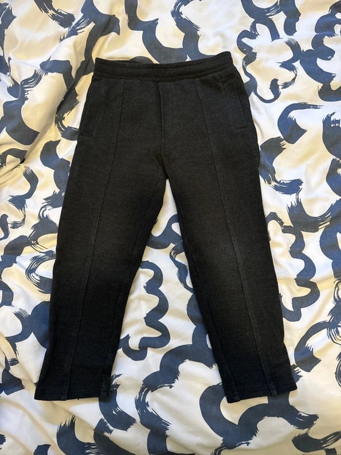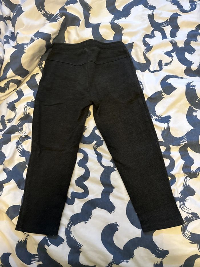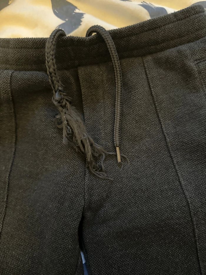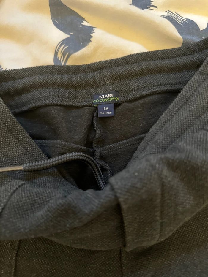 Pantalon couleur gris anthracite Matière survêtement Taille élastique Très bon état le seul défaut est le cordon où il manque l embout ( voir dernière photo) Taille 6 ans Marque Kiabi