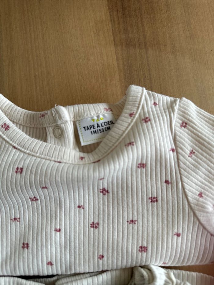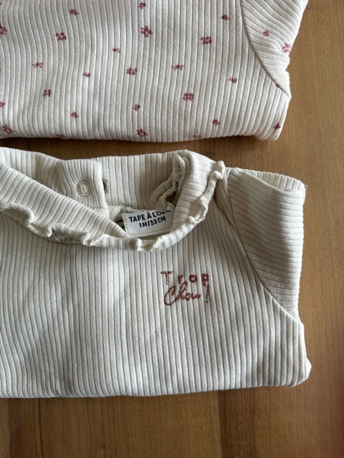Lot 2 t-shirts neufs en coton manches longues Couleur blanc avec motifs (voir photo) Marque tape à l oeil Taille 1 mois