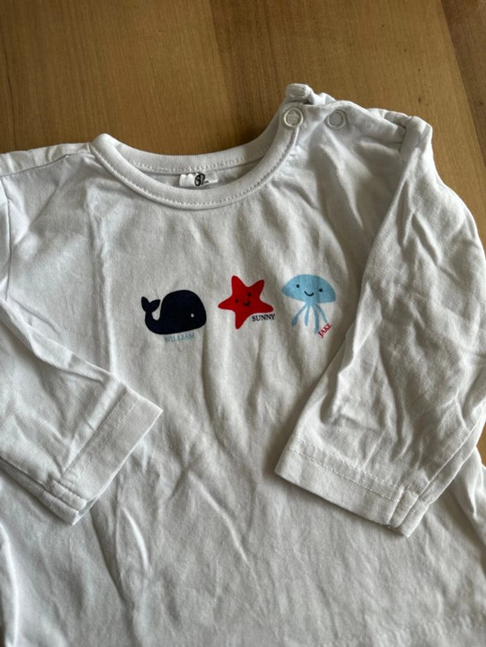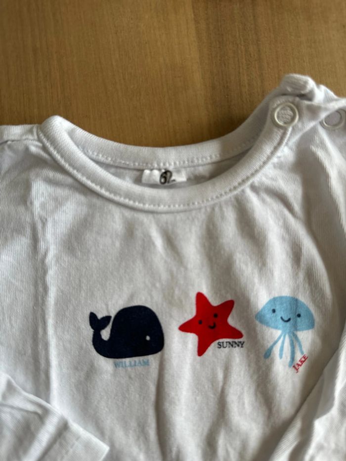 T-shirt neuf en coton manches longues Couleur blanc avec motifs (voir photo) Taille 6 mois