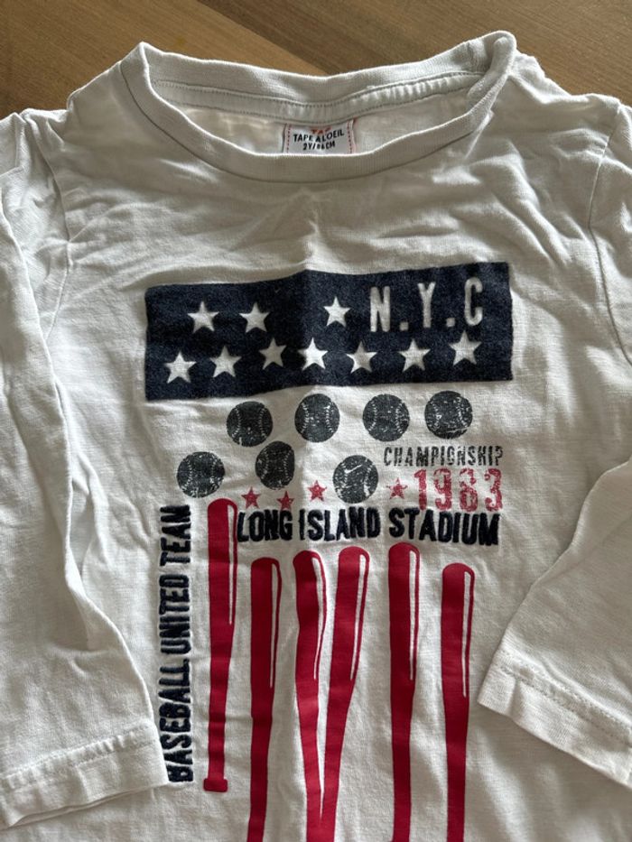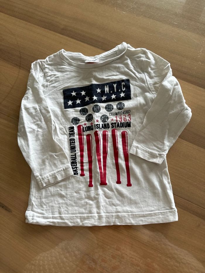 T-shirt manches longues en coton. Couleur blanc avec motifs Taille 2 ans Très bon état. Marque tape à l oeil