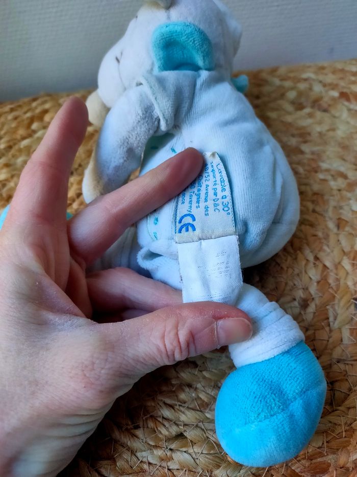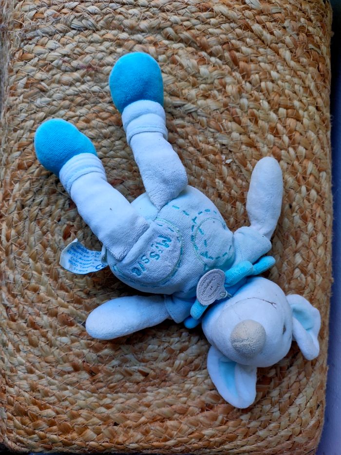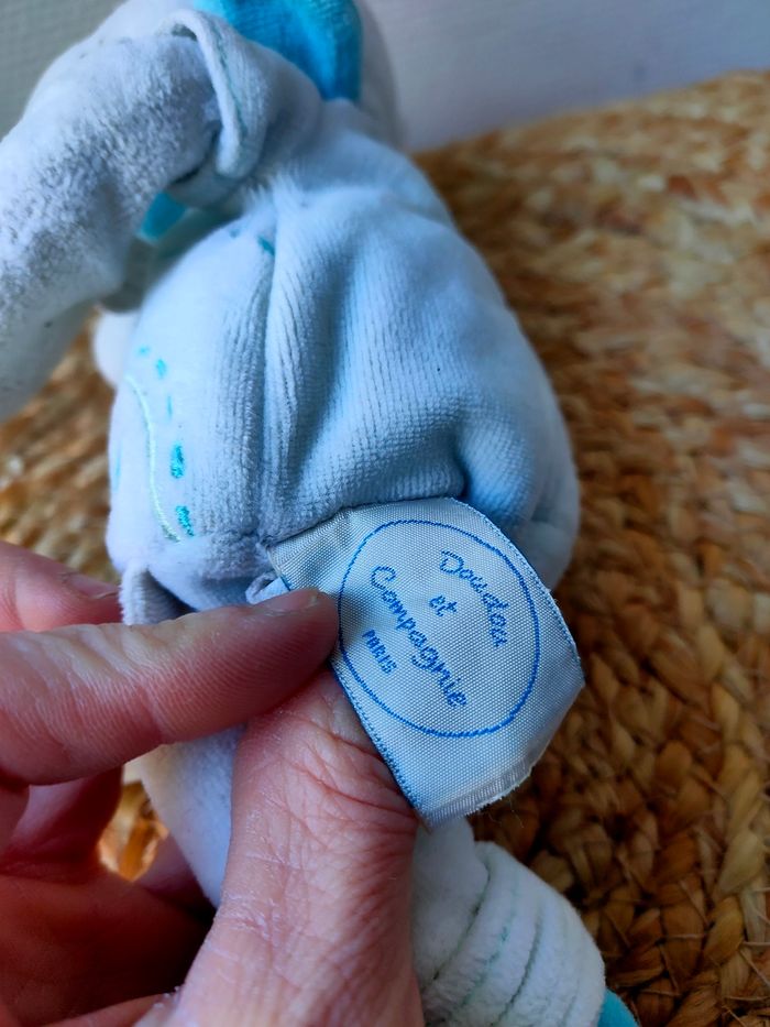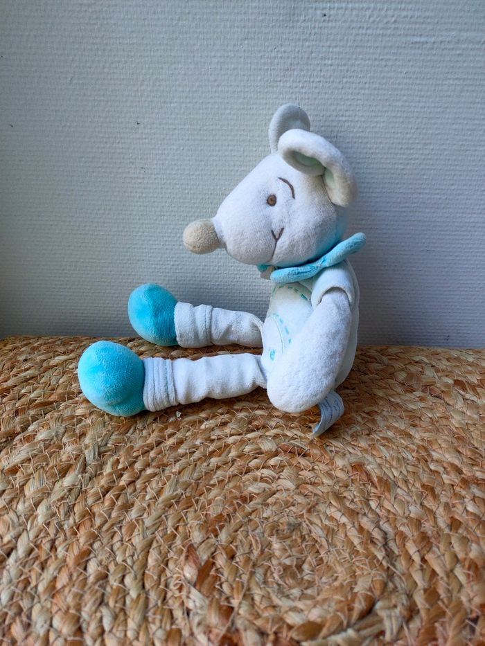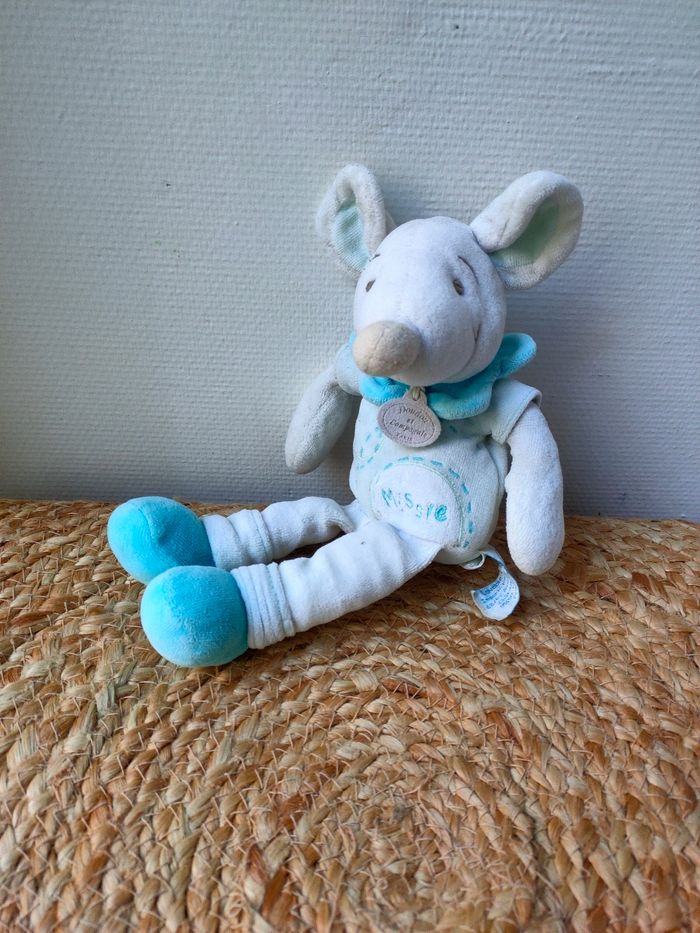 Doudou souris Missie coloris blanc/bleu/vert marque Doudou et compagnie. Taille 20cm approximatif. Il est en très bon état. Prix ferme, PAS DE NÉGO !!!