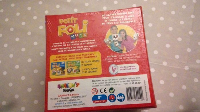 Jeu Petit foli mots sur les animaux a partir de 5 ans de 1 a 6 joueurs duree 15 min Jamais la lecture et l'orthographe n'auront été si faciles et si drôles ! 80 cartes double face pour s'amuser à lire et écrire les animaux. Achete 16,90€ vendu 3,50€ #jouet_missteph37 #jeusociete_missteph37
