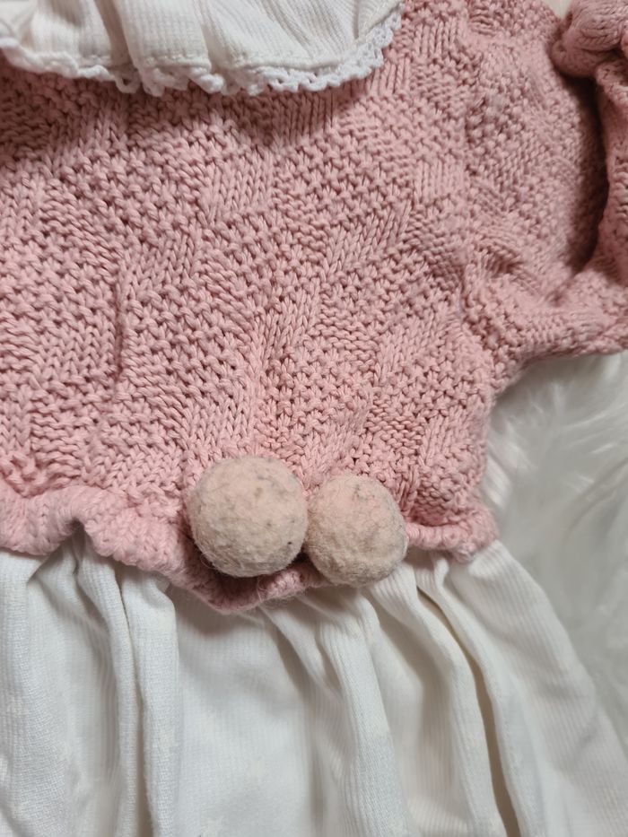 Robe combinée Haut en maille rose Col et bas en tissu Le bas est blanc/ecru avec motifs étoiles (Très bonne état général, juste les pompon regardee photo) Fabriqué au Portugal 6m