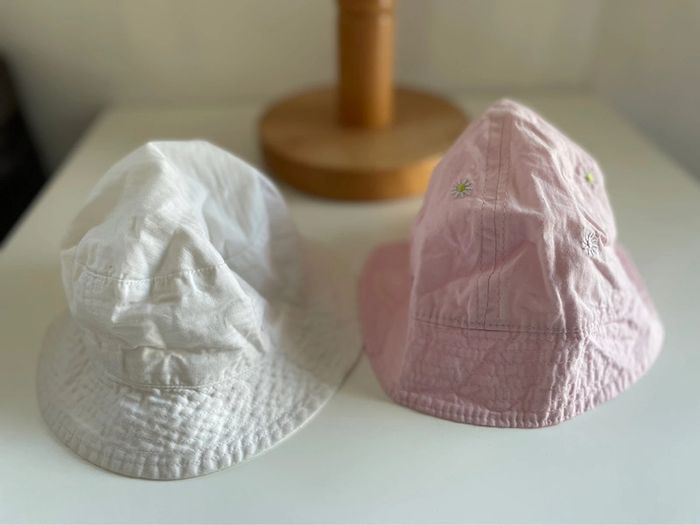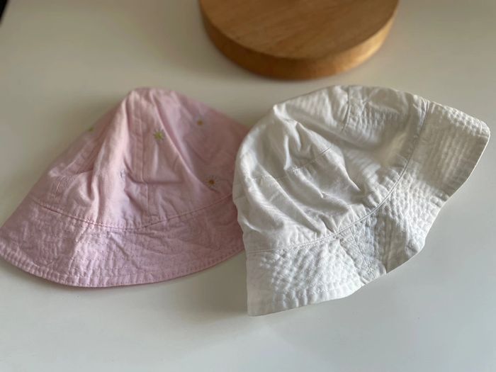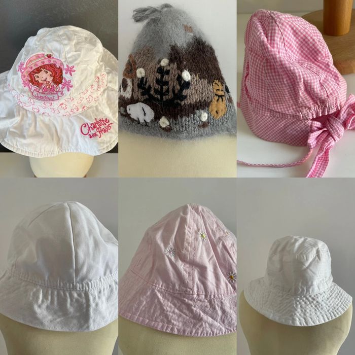 #zezettedelavegaaccessoires Charlotte au fraise taille 49cm Gris avec cordon 46cm Rose rayure blanche 46cm Rose fleur jaune et blanc à droite 47cm Blanc a gauche 46cm 4€ le chapeau