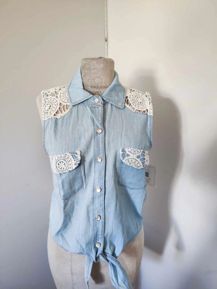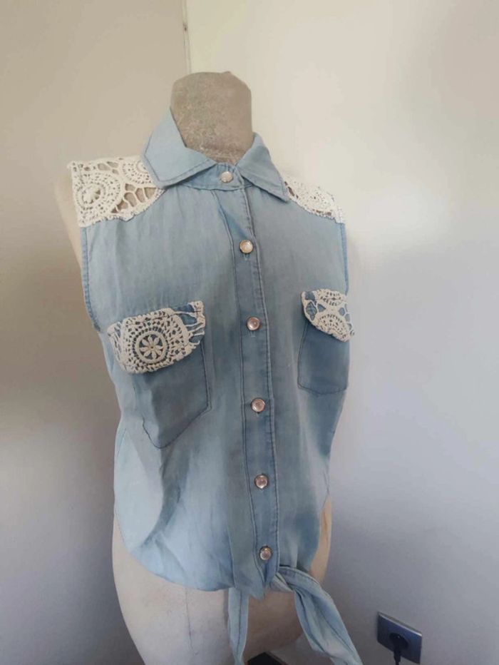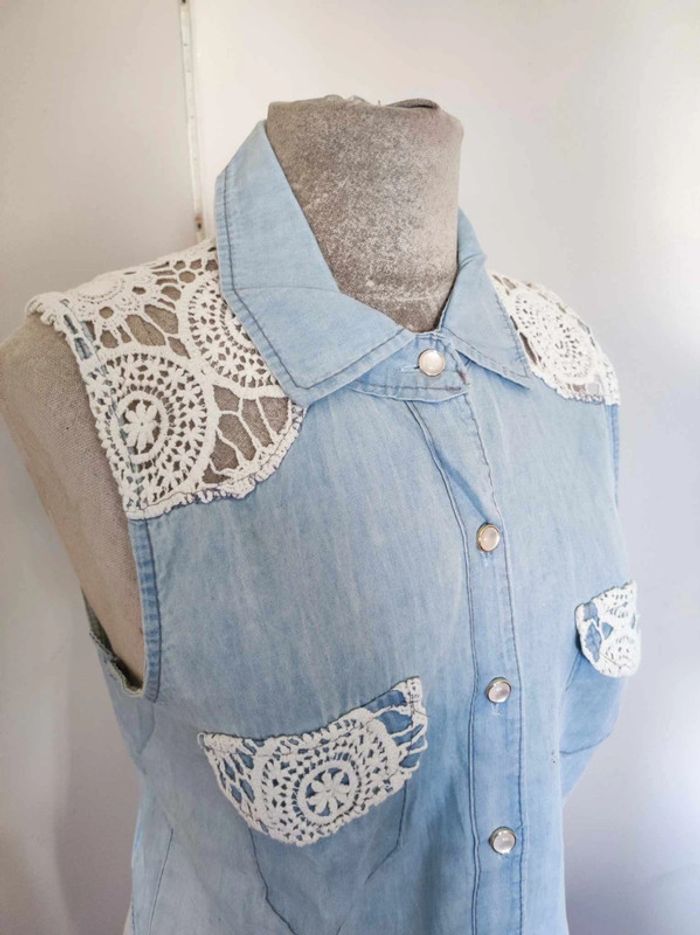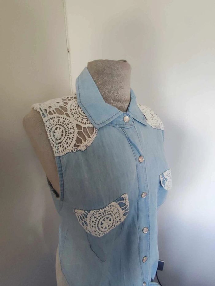 Chemise sans manche en jean. Déco dentelle. #courte #noeudalataille #croptop #été #plage #tendance #mov59Femme