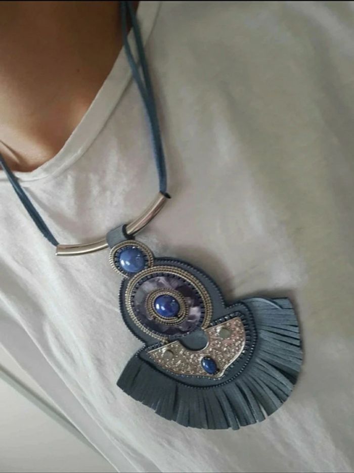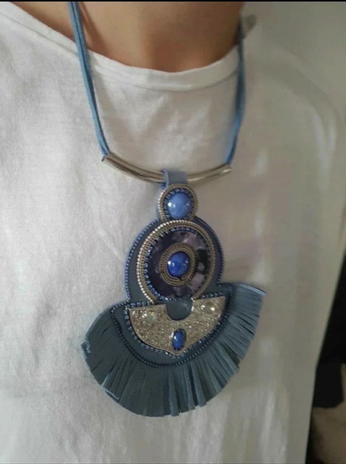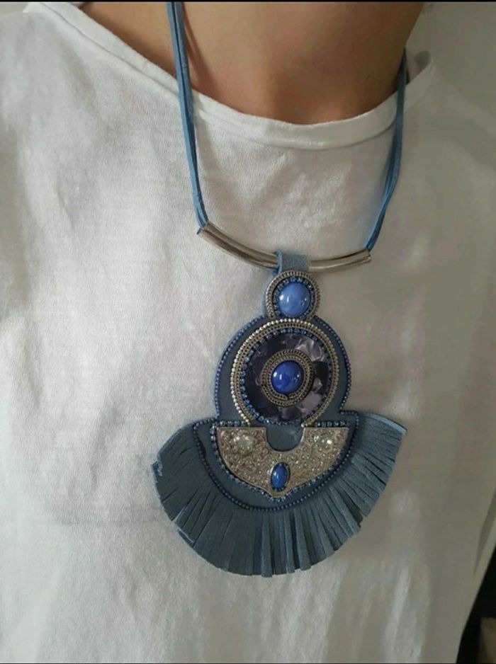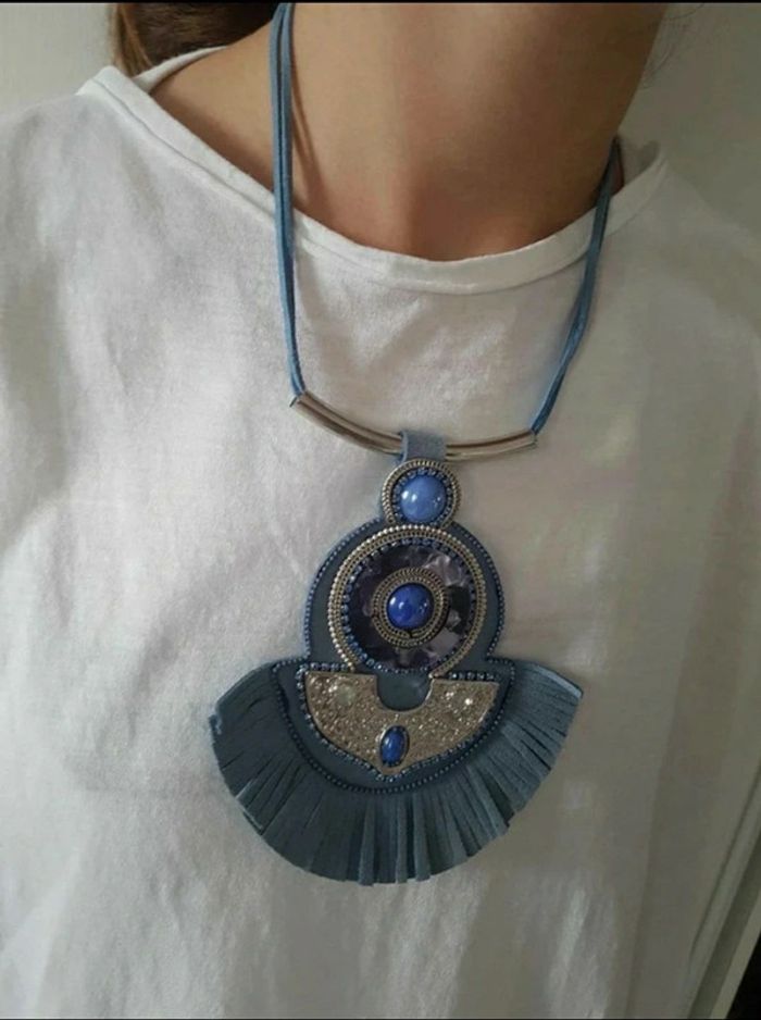 Collier fantaisie, jamais porté. #frange #pompon #perles #pendentif #chaîne #sautoir #ethnique #multicouleurs #bleuclair #bleuroi #mov59accessFem