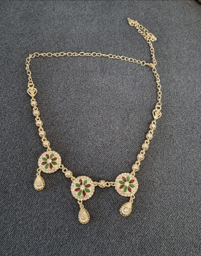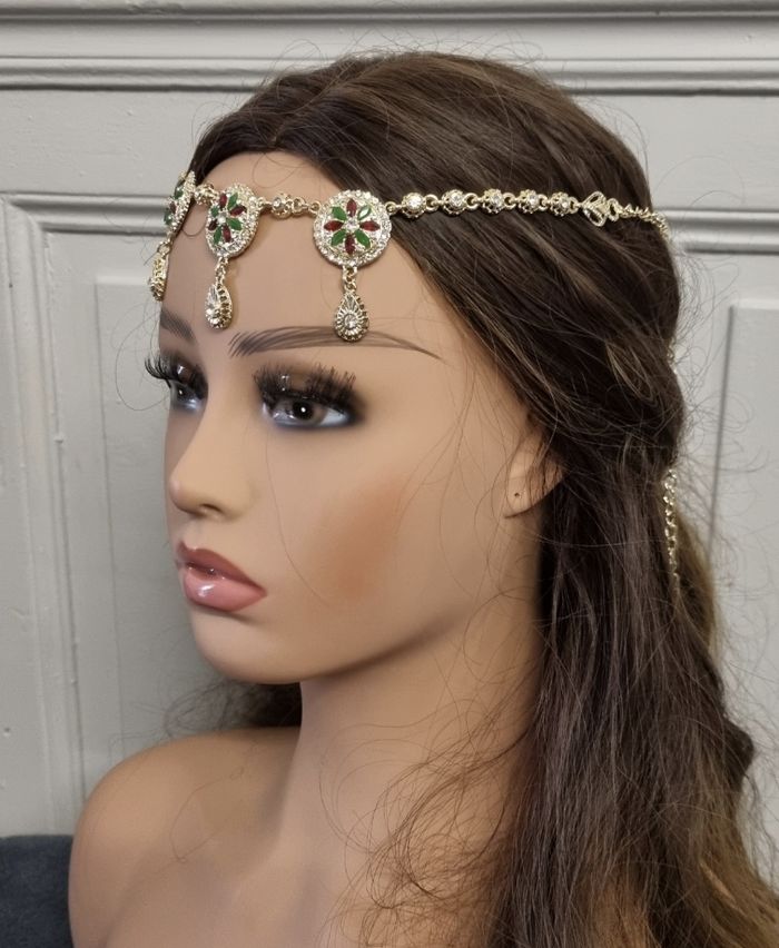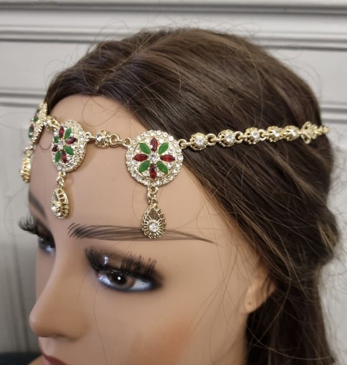 Sublimez votre coiffure avec ce magnifique bijou de tête "Jbine", symbole de grâce et de raffinement oriental. Composé d'une chaîne dorée ornée de médaillons délicatement décorés de motifs floraux rouges et verts, il est agrémenté de pendentifs élégants en forme de goutte sertis de cristaux scintillants. Parfait pour les mariages, les fiançailles ou les occasions spéciales, ce bijou ajoute une touche majestueuse et authentique à votre allure.