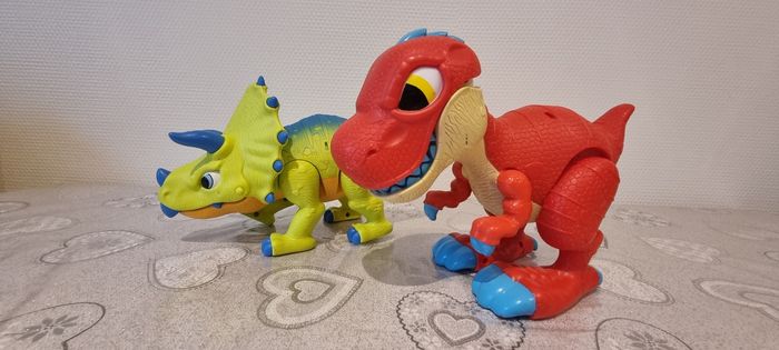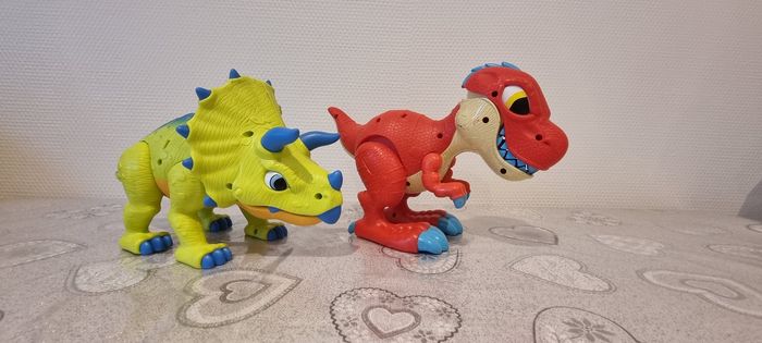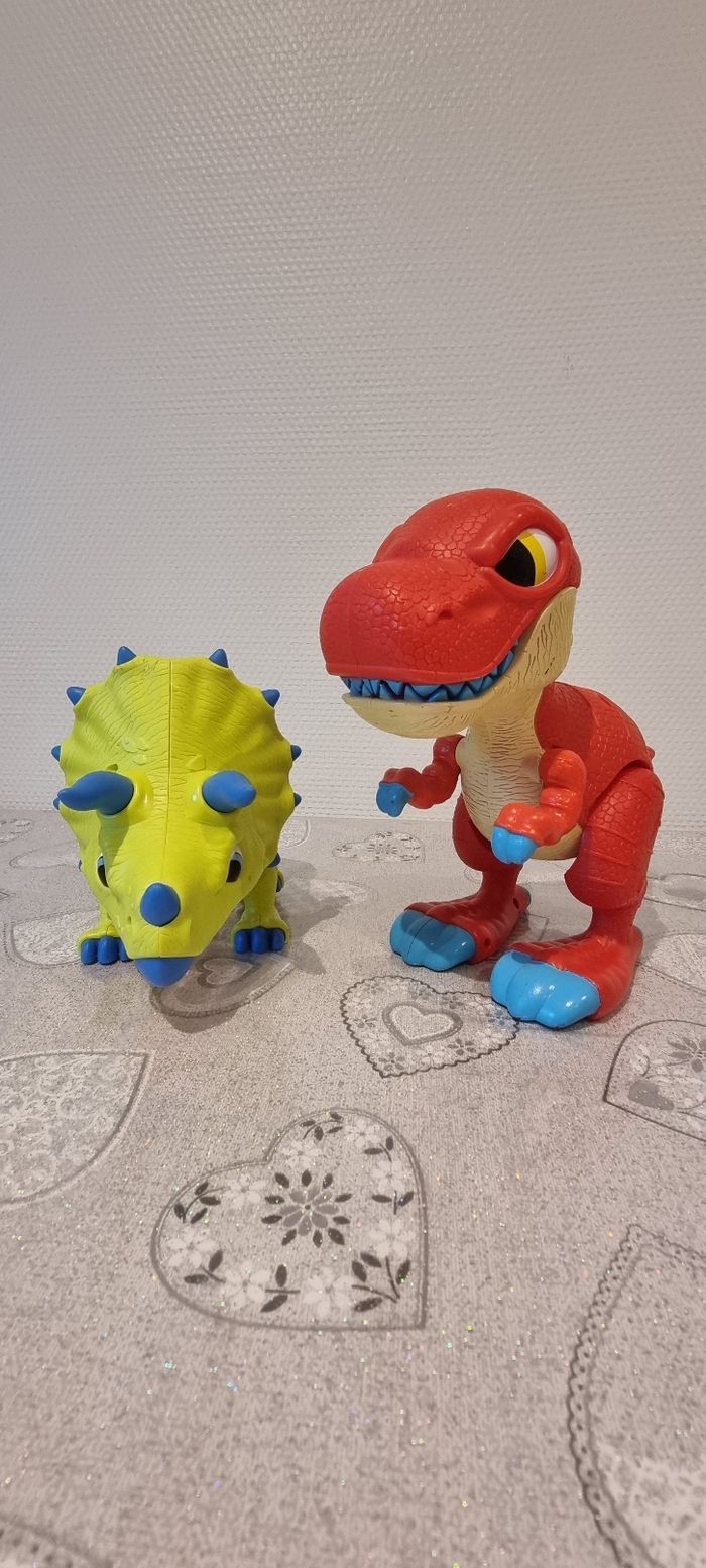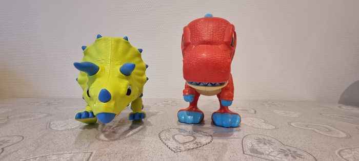 Voici deux adorables figurines de dinosaures que je souhaite vendre ! La première est un dinosaure jaune avec des piques bleus sur le dos (tricératops), tandis que la seconde est un dinosaure rouge avec de grandes dents(tyrannosaure). Ces jouets sont parfaits pour les enfants qui aiment les créatures préhistoriques. Ils sont en bon état et prêts à être adoptés par une nouvelle famille. N'hésitez pas à me contacter si vous avez des questions !