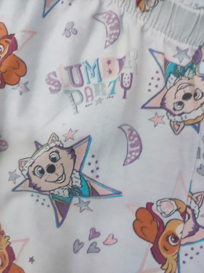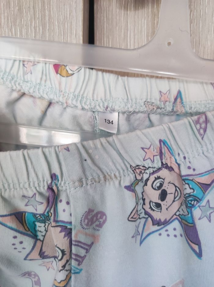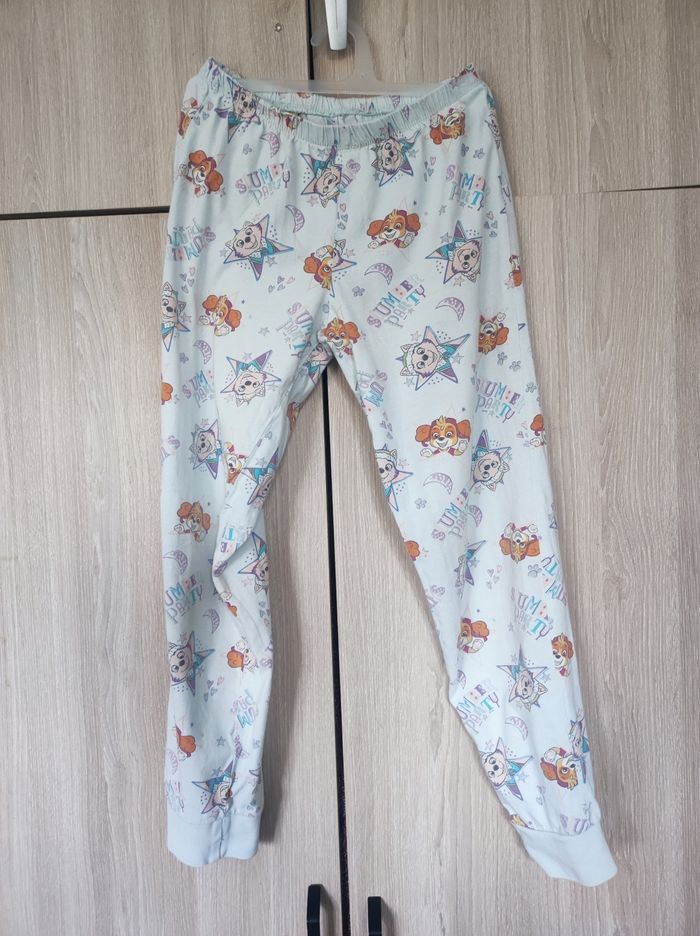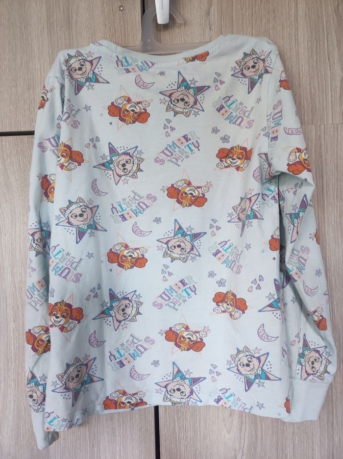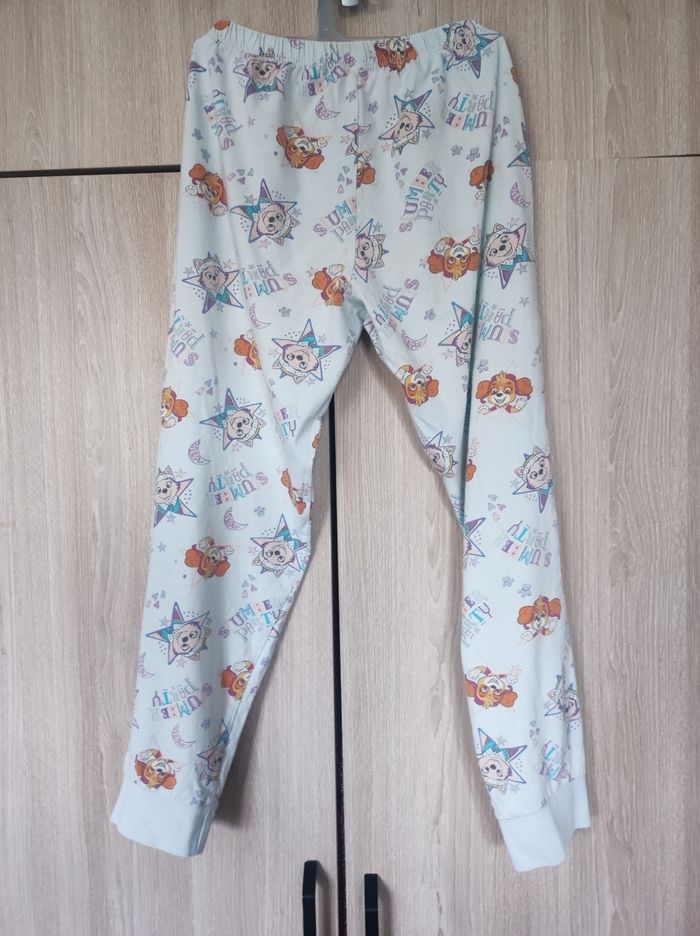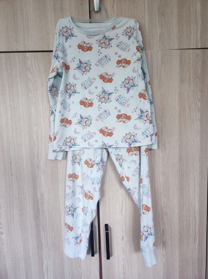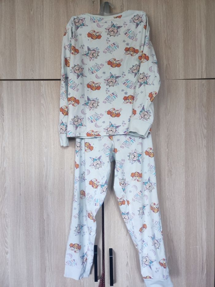 Pyjama 2 pièces 134 cm Sans marque Composé d'un sweat a manche longues & col rond avec un pantalon taille extensible En coton et elasthanne Coloris bleu clair avec motifs chiens en bonnet d'hiver écrit summer party Tres bon etat Une mini tache niveau ceinture ( visible photo)