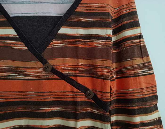 MERCI DE BIEN LIRE L'ANNONCE ET TENIR COMPTE DES MESURES INDIQUEES. ETAT IMPECCABLE. T SHIRT A RAYURES MULTICOLORE. DEGRADE ORANGE, MARRON ET BEIGE. COL ORIGINAL. EFFET CACHE COEUR. MANCHES 3/4. CAMAIEU. TAILLE 36 / 38. HAUTEUR : 57 CM. LARGEUR EPAULES : 38 CM. LARGEUR AISSELLES : 41,5 CM. LONGUEUR EPAULE - POIGNET : 46 CM. LONGUEUR AISSELLE - POIGNET : 31 CM. TAILLE : 34,5 CM. BASE : 40 CM. MATIERE INCONNUE CAR ETIQUETTE RETIREE. ENVOI SOUS 24 / 48 HEURES. REMISE EN MAIN PROPRE. zo