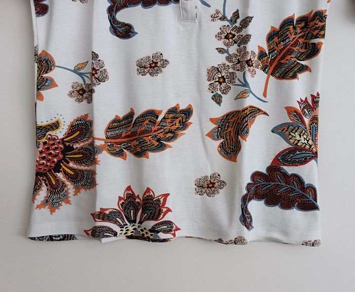 MERCI DE BIEN LIRE L'ANNONCE ET TENIR COMPTE DES MESURES INDIQUEES. ETAT IMPECCABLE. T SHIRT BLANC IMPRIME FEUILLES ET FLEURS MULTICOLORE. COL EN V A BOUTONS. CAMAIEU. TAILLE 36. HAUTEUR : 54,5 CM. LARGEUR EPAULES : 35,5 CM. LARGEUR AISSELLES : 44 CM. TAILLE : 38 CM. BASE : 42,5 CM. MATIERE INCONNUE CAR ETIQUETTE RETIREE MAIS A PRIORI COTON ET ELASTHANNE. ENVOI SOUS 24 / 48 HEURES. REMISE EN MAIN PROPRE. zo
