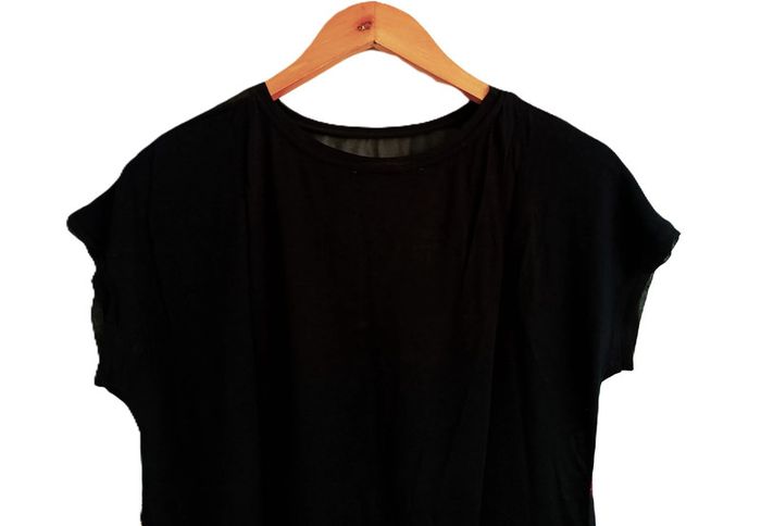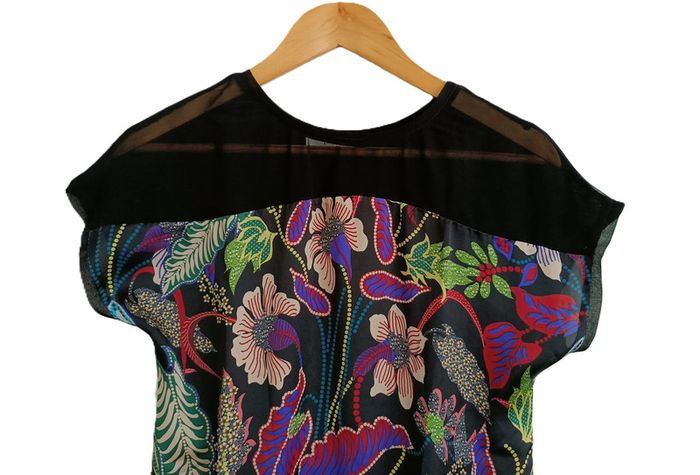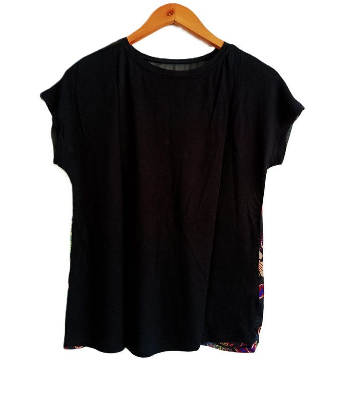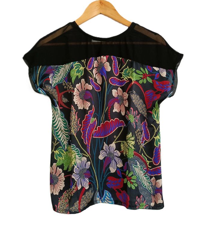 .  ARTICLE DISPONIBLE DANS LE CAS CONTRAIRE L'ANNONCE EST RETIREE ETAT IMPECCABLE. T SHIRT NOIR. FLEURS MULTICOLORE. LA PARTIE NOIRE DEVANT EST EN VOILE. MANCHES COURTES. PROMOD. TAILLE 38. HAUTEUR : 62 CM. LARGEUR AISSELLES : 48 CM. BASE : 49 CM. POLYESTER. ELASTHANNE. ENVOI SOUS 24 / 48 HEURES. REMISE EN MAIN PROPRE. zo