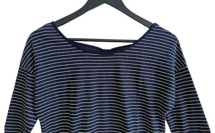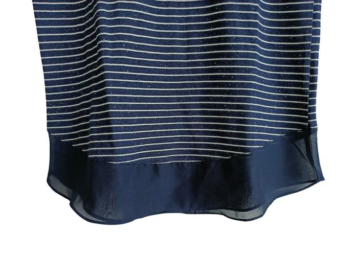 .  ARTICLE DISPONIBLE DANS LE CAS CONTRAIRE L'ANNONCE EST RETIREE ETAT IMPECCABLE. T SHIRT RAYE BLEU MARINE ET BLANC. MANCHES 3/4. BASE EN VOILE BLEU MARINE. AU DOS UN NOEUD EN VOILE BLEU MARINE. BASE LEGEREMENT ARRONDIE. CAMAIEU. TAILLE S / 38. HAUTEUR : 67 CM. LARGEUR AISSELLES : 51,5 CM. TAILLE : 43 CM. BASE : 44 CM. 80 % COTON. 20 % POLYESTER. ENVOI SOUS 24 / 48 HEURES. REMISE EN MAIN PROPRE. zo