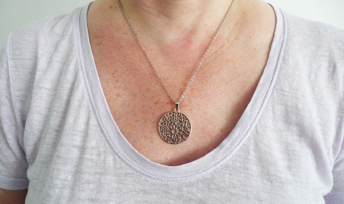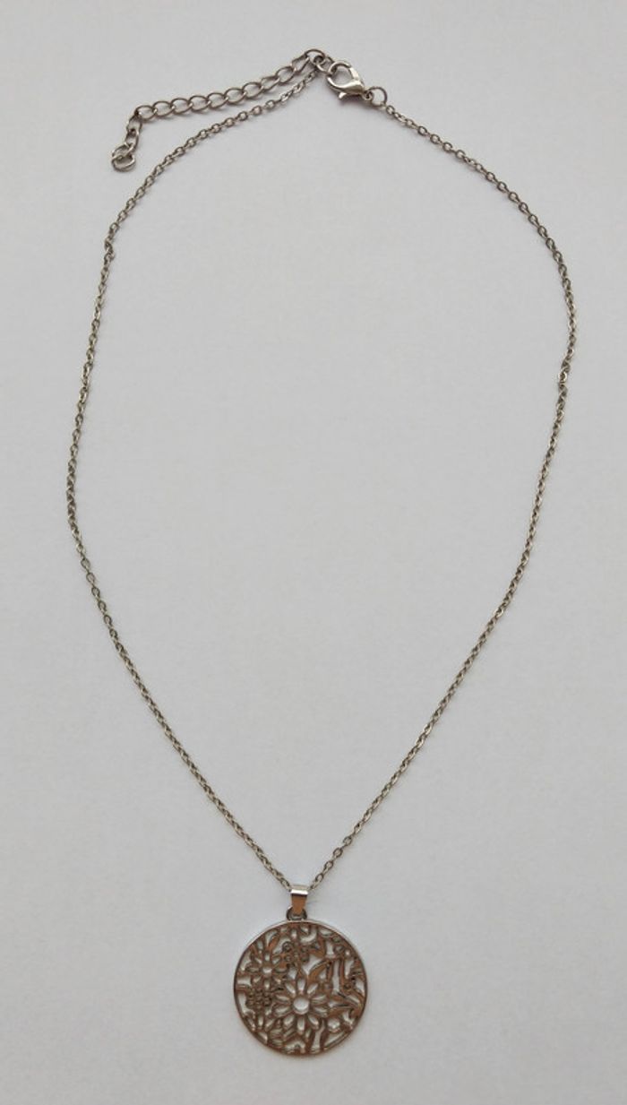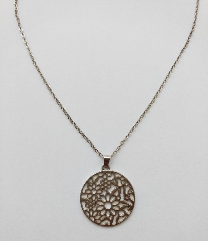 Collier a pendentif rond a fleurs ciselees. metal argente. - photo numéro 1