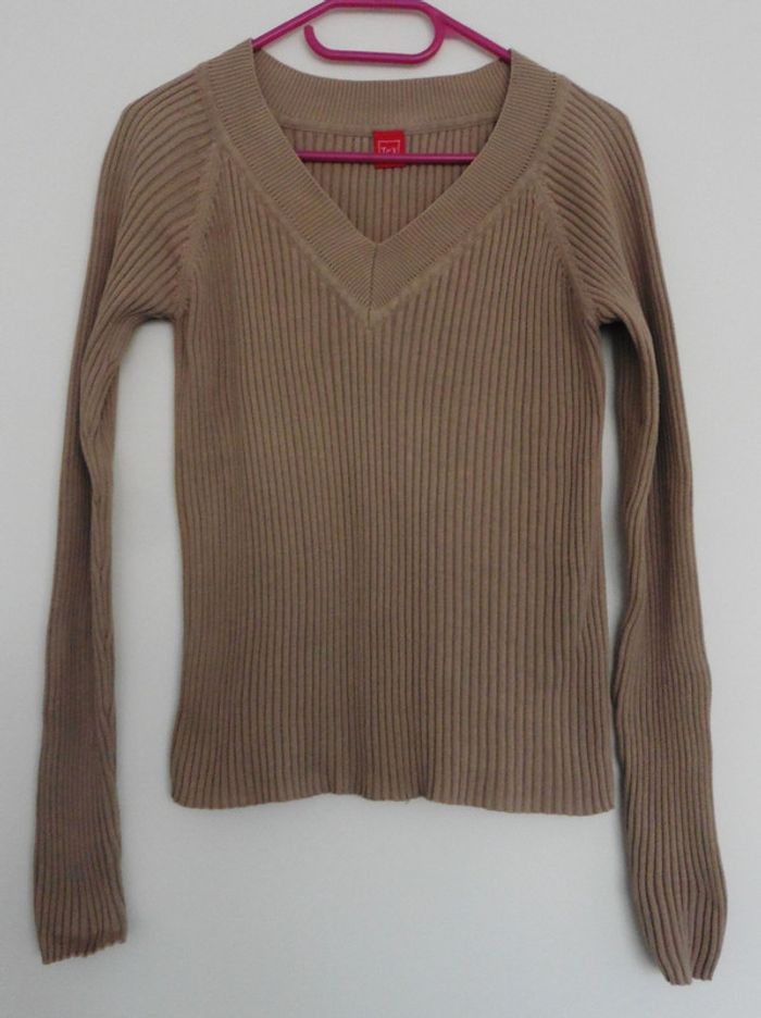 Pull beige cotele. Col en v. Tex. Coton. Taille 36 - photo numéro 1