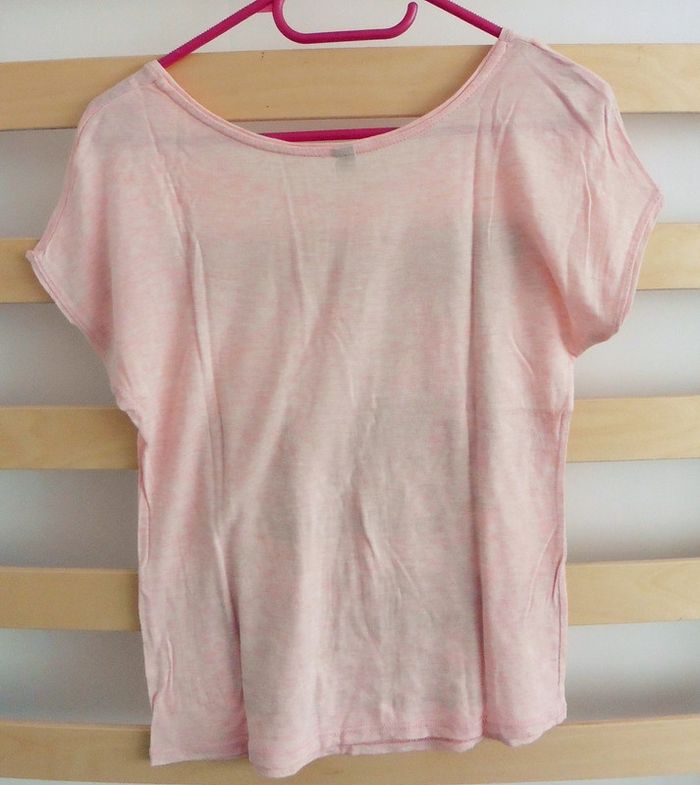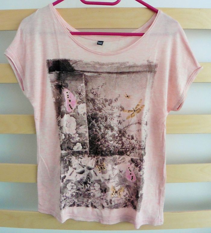 T-shirt rose. Imprimé rose et noir. Papillons et arbre. Pimkie. Taille 38 - photo numéro 2
