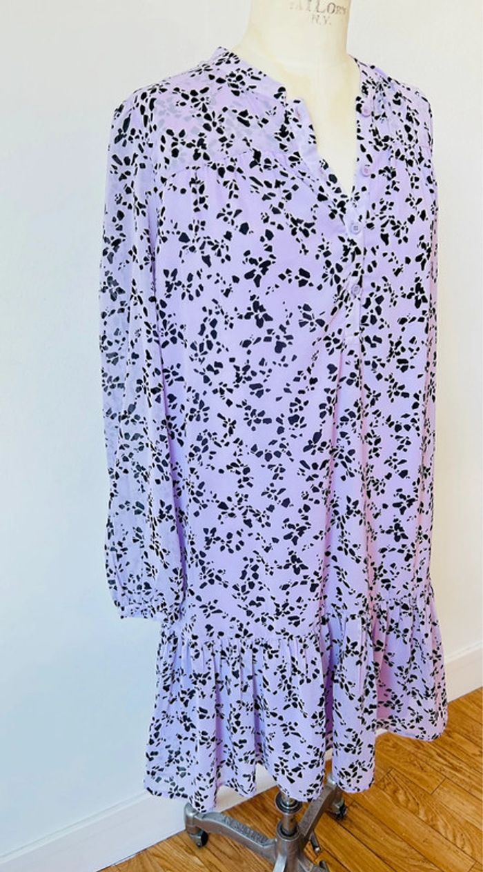 Jolie Robe chemise d’été Esprit , en voile , matière légère et fluide , collection récente, doublé, longue manche , coupe évasé, col à boutons parfait pour un look bohème chic, couleur : mauve à motif noir , confortable et tendance taille 40 , valeur : 69.99€